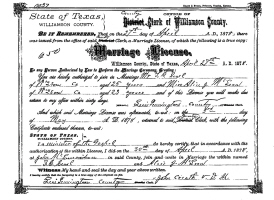 Thomas Greenfield Searl (age 25), a bachelor, and Alice Jamima McLean (age 23), a maiden, were married April 30, 1878, in Taylor, Williamson Co., TX.