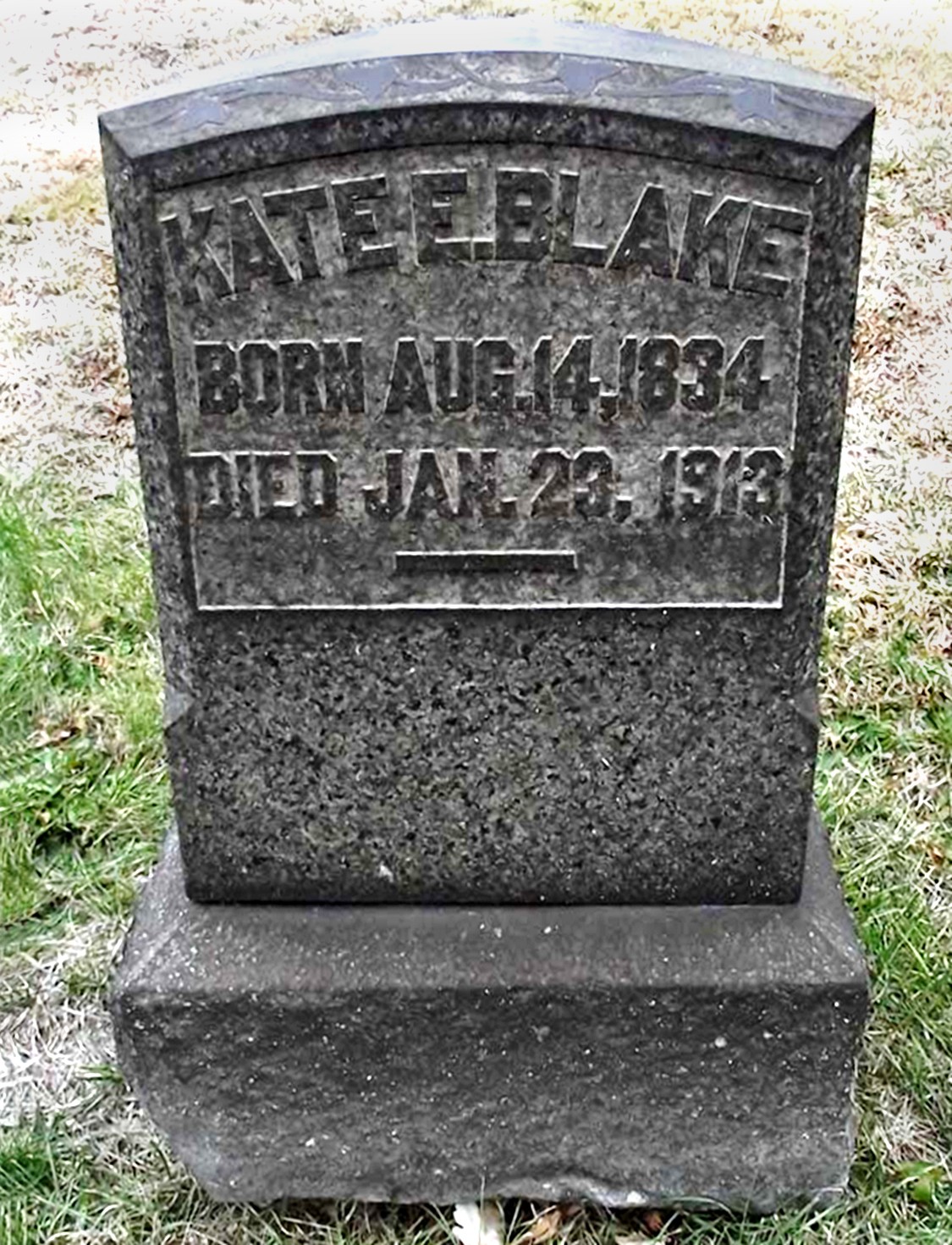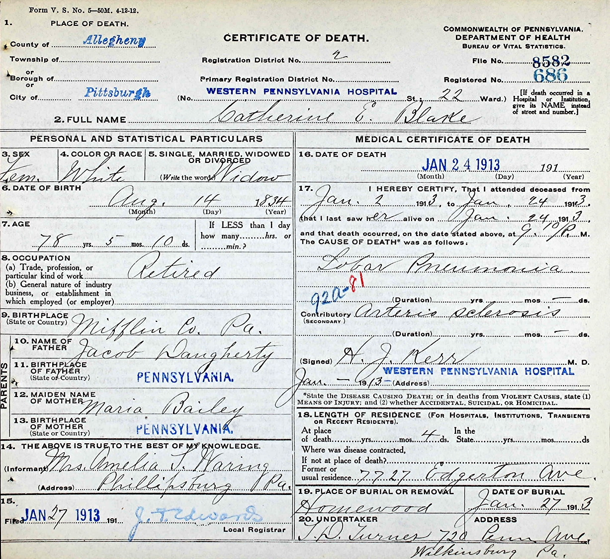 Katherine E. "Kate" (Daugherty) (Taylor) Blake died January 24, 1913, at Western Pennsylvania Hospital, Pittsburgh, Allegheny Co., PA, at age 78. Buried in Homewood Cemetery, Pittsburgh, Allegheny Co., PA.