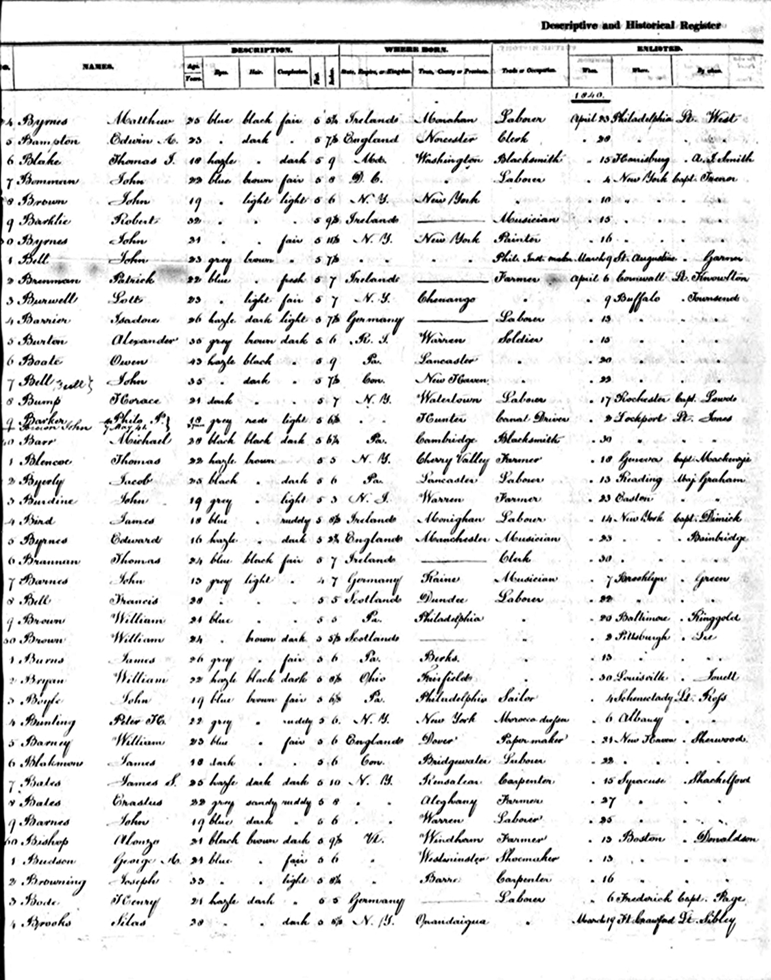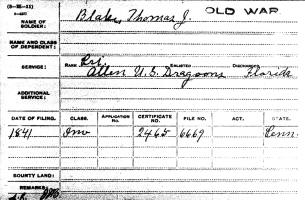 Thomas Jefferson Blake Sr. enlisted in the Army, 1st Regiment of Light Dragoons, Company E, on April 15, 1840, at Harrisburg, MD, for a period of 5 years. He was born in Maryland, was 18 years of age, Hazel eyes, Dark Hair, Dark Complexion, and a Blacksmith. This was during the period of the Indian Wars.