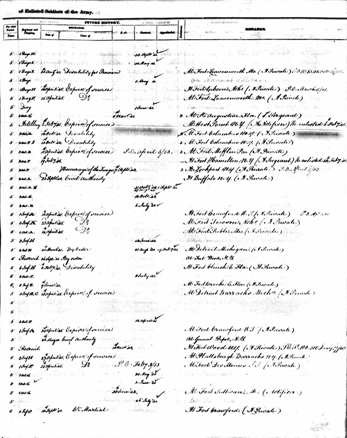 Thomas Jefferson Blake Sr. was discharged from the army on August 25, 1841, at Fort Leavenworth, MO, due to Disability for Pension.
