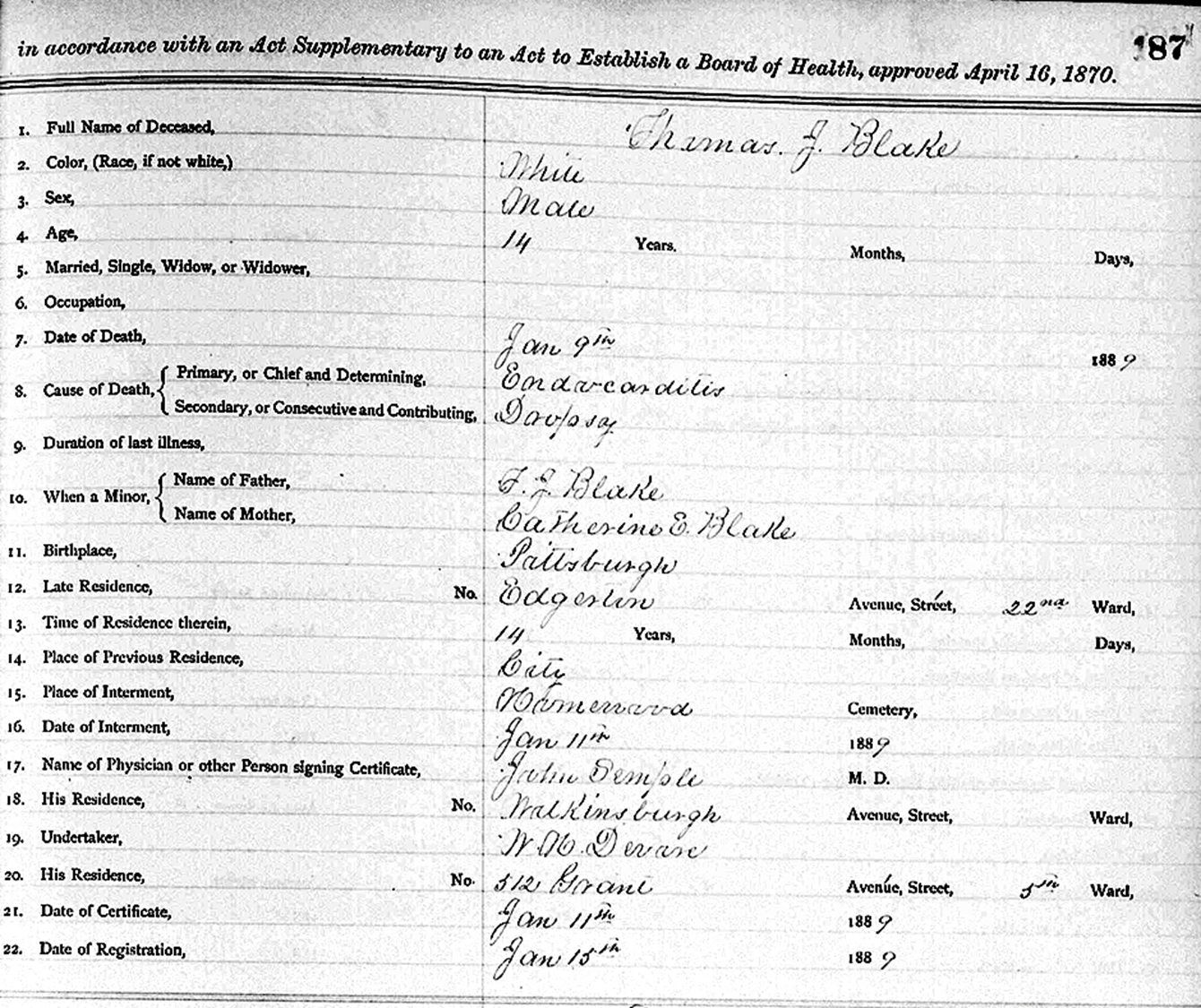 Thomas Jefferson Blake Jr. died January 9, 1889, in Pittsburgh, Allegheny Co., PA, at age 15. Buried in Homewood Cemetery, Pittsburgh, Allegheny Co., PA.