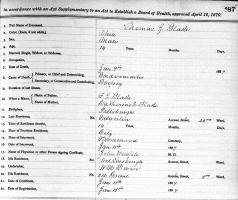 The 1880 U. S. Census taken on June 4, 1880, shows Thomas J. Blake (age 55) born in Maryland to Pennsylvania-born parents, is a married Blacksmith, and is living in the 22nd Ward, Pittsburgh, Allegheny Co., PA. Living with him are: his wife, Catherine Blake (age 45) born in Pennsylvania to Pennsylvania and New York-born parents, who in Keeping House; his son, Thos. J. Blake (age 6) born in Pennsylvania to Maryland and Pennsylvania-born parents; his unmarried step-son, Wm. M. Taylor (age 16) born in Pennsylvania to Pennsylvania-born parents; and his unmarried niece, May Waring (age 16) born in Pennsylvania to Pennsylvania-born parents.