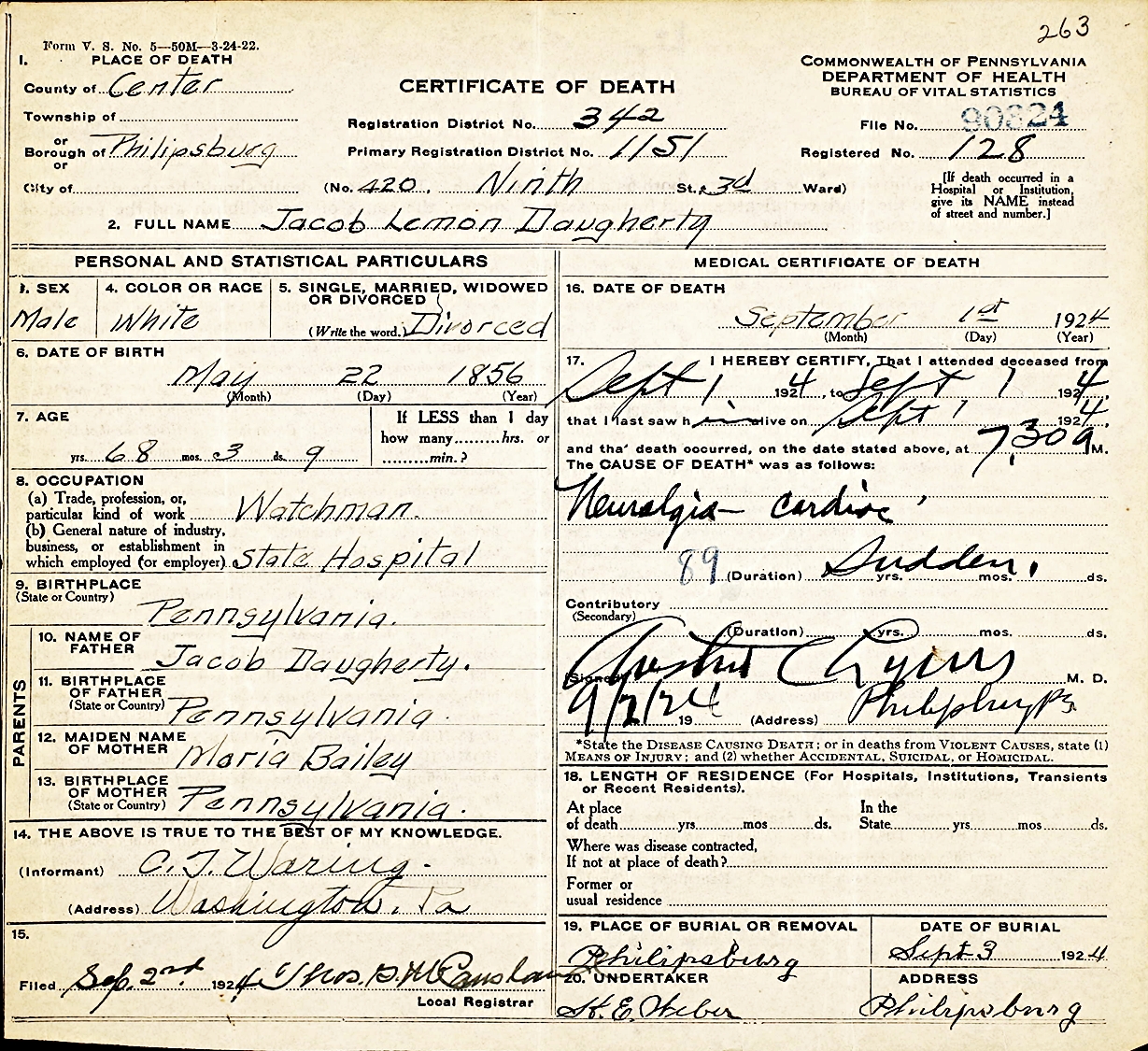 Jacob Lemon Daugherty died September 1, 1924, in Centre Co., PA, at age 68. Buried in Philipsburg Cemetery, South Philipsburg, Centre Co., PA.