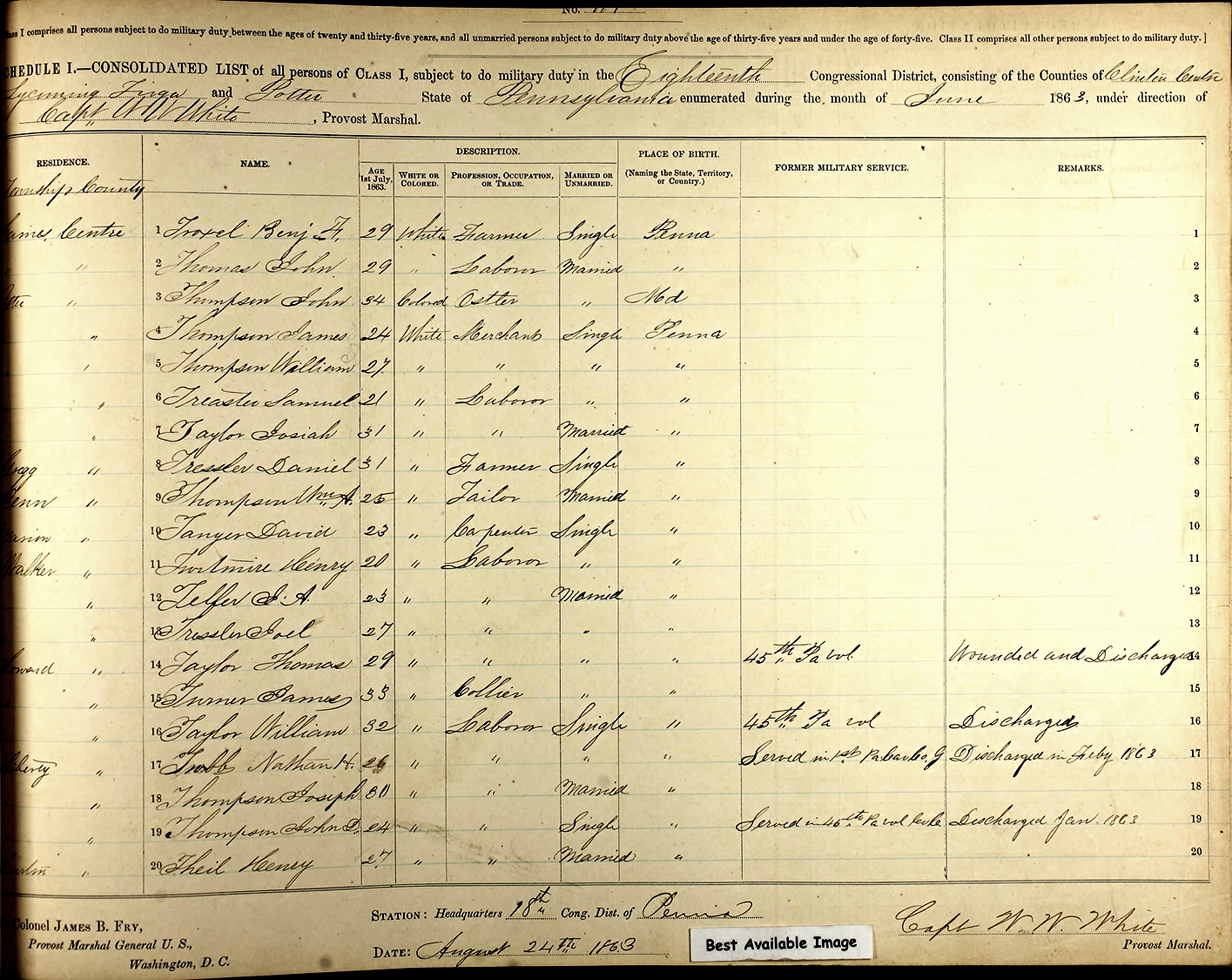 William C. Taylor enlisted as a Private on August 16, 1861, in Co. A, 45th Regiment, Pennsylvania Volunteers; mustered in on October 21, 1861, at Camp Curtin, Harrisburg, Pa, for a three year's term; and was discharged on Surgeon's Certificate, on December 21, 1862.