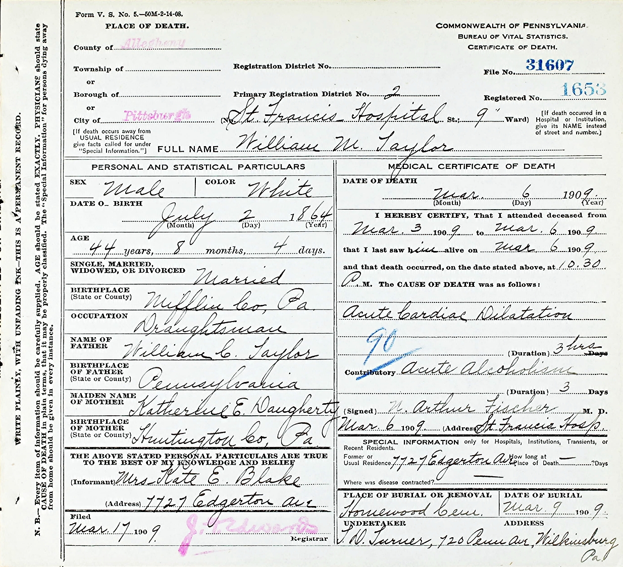 - William McClelland Taylor : Born July 2, 1864, in Mifflin Co., PA; Died March 6, 1909, at St. Francis Hospital, 9th Ward, Pittsburgh, Allegheny Co., PA (age 44). Buried in Homewood Cemetery, Pittsburgh, Allegheny Co., PA. Married September 30, 1891, in Pittsburgh, Allegheny Co., PA, to Mollie Oliver: Born June 15, 1867, in Pittsburgh, Allegheny Co., PA; Died after 1910 in Unknown. Divorced.