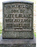The 1900 U. S. Census taken on June 11, 1900, shows Kate Blake (age 65) born August, 1834, in Pennsylvania to Pennsylvania-born parents, and with 1 of the 3 children born to her still alive, is a widowed Head of Household, and who owns her home free of a mortgage, and is living on Edgerton Ave., 22nd Ward, Pittsburgh, Allegheny Co., PA. Living with her are: her married son, William M. Taylor (age 35) born July, 1864, in Pennsylvania to Pennsylvania-born parents, and married for 9 years, a Draftsman; and her unmarried niece, May Waring (age 35) born July, 1864, in Pennsylvania to Pennsylvania-born parents, who does Laundry.