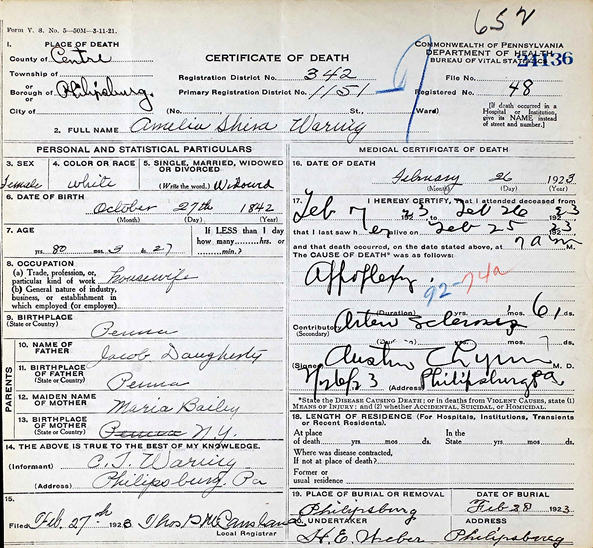 Amelia Shira (Daugherty) Waring died February 26, 1923, in Philipsburg, Centre Co., PA, at age 80. Buried in Philipsburg Cemetery, South Philipsburg, Centre Co., PA.