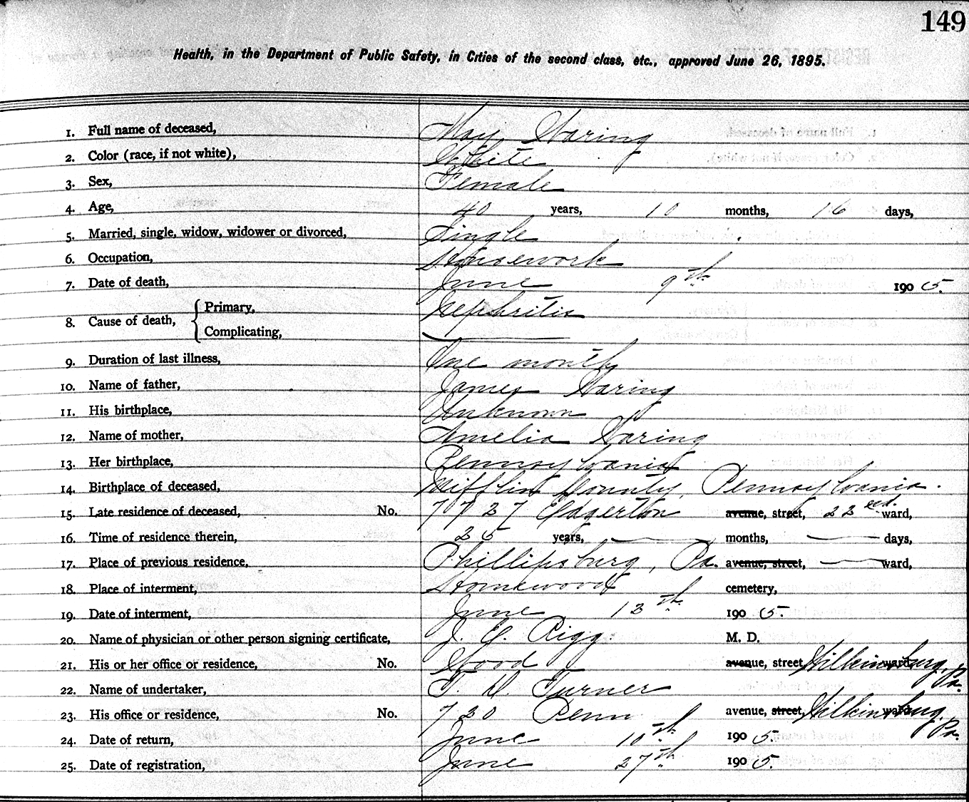 May Waring died June 9, 1905, at her home, Pittsburgh, Allegheny Co., PA, at age 40. Buried in Homewood Cemetery, Pittsburgh, Allegheny Co., PA.