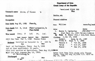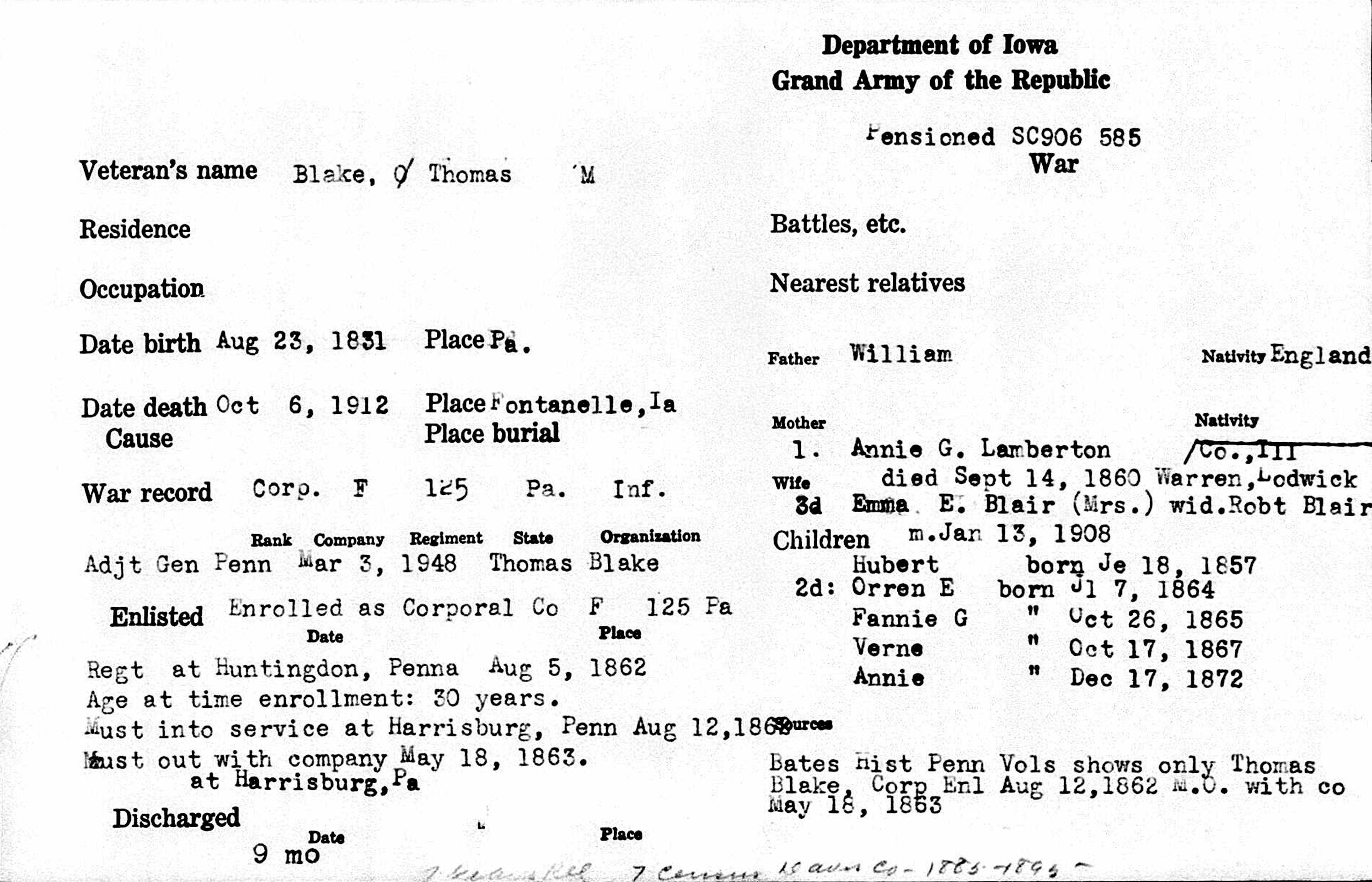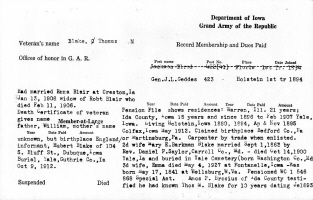 Thomas Monroe "Tom" Blake Grand Amy of the Republic soldier records for Iowa. It lists the date and place of birth for all of his children. It also lists his spouses. This is a gold mine of information about his immediate family