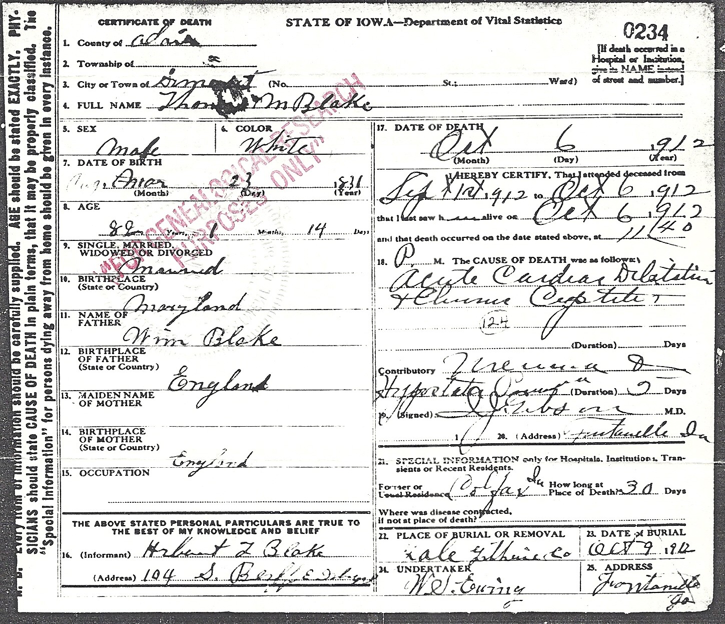 Thomas Monroe "Tom" Blake was born August 23, 1831, in Martinsburg, Bedford (Blair) Co., PA, and died October 6, 1912, in Town of Fontanelle, Summerset Twp., Adair Co., IA, at age 81. Buried in Lot 18, Yale Cemetery, Cass Twp., Guthrie Co., IA. He is the son of Burdine Blake Sr. of Washington Co., MD, and Mazey Ann Simpkins of Hagerstown, Washington Co., MD.