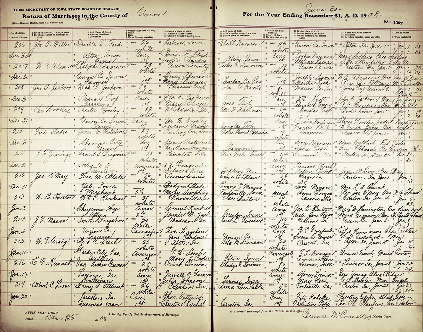 Thomas Monroe "Tom" Blake, a widower, and Emma E. (Mingus) Blair, a widow, were married January 1, 1908, in Creston, Union Co., IA.