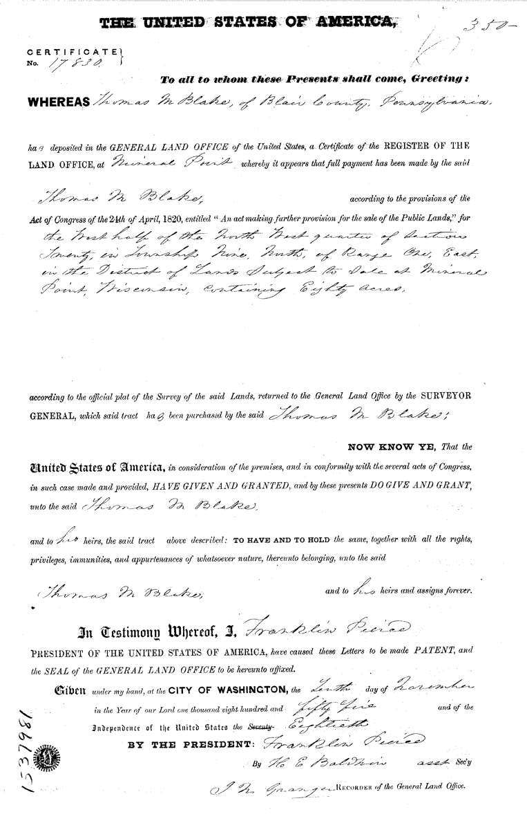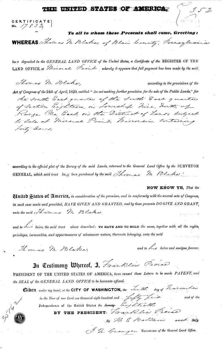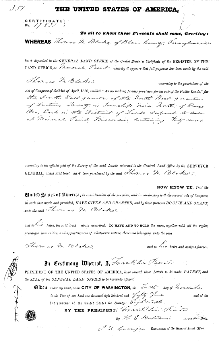 On May 15, 1857, Thomas M. Blake of Blair County, Pennsylvania, was granted a Land Patent for 80 acres of land in the S 1/2 of the NW 1/4 of Section 9, T10N, R1W, in the Town of Eagle, Twp., Richland Co., WI.
