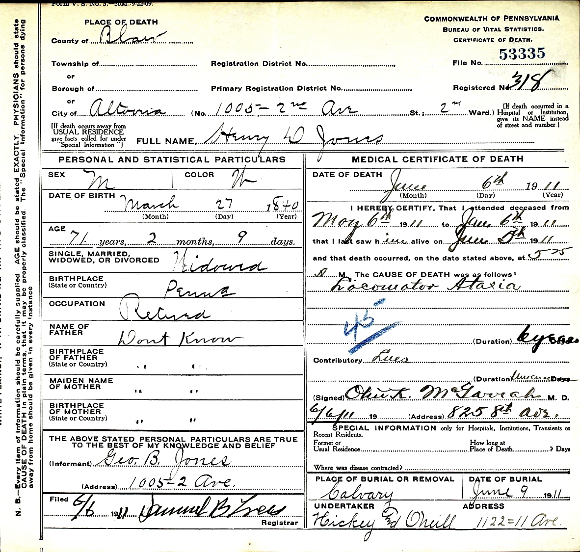 Henry David Jones died June 6, 1911, in Altoona, Blair Co., PA, at age 71. Buried in Calvary Cemetery.