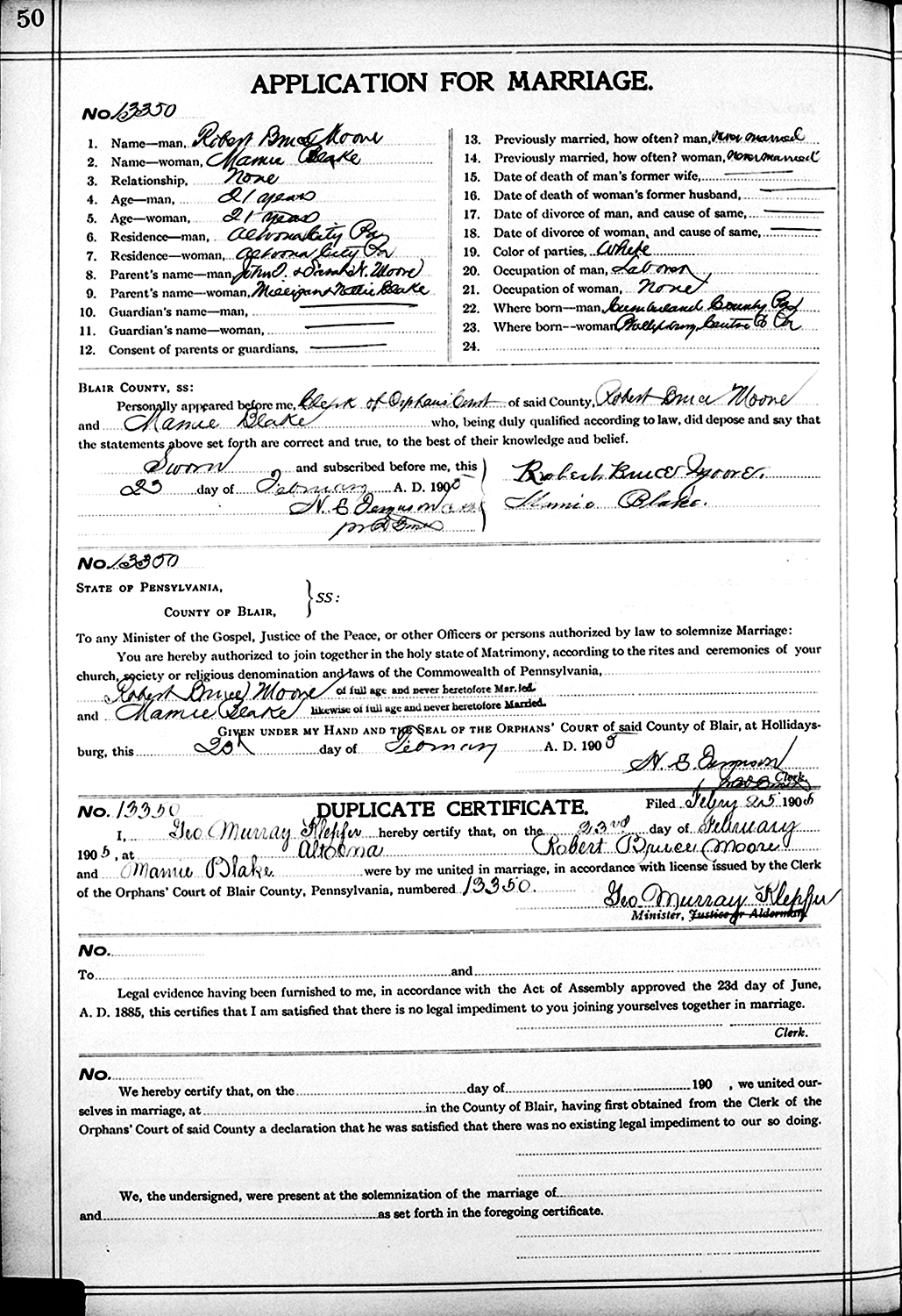 Robert Bruce Moore and Mary A. "Mamie" Blake were married February 23, 1905, in Altoona, Blair Co., PA.