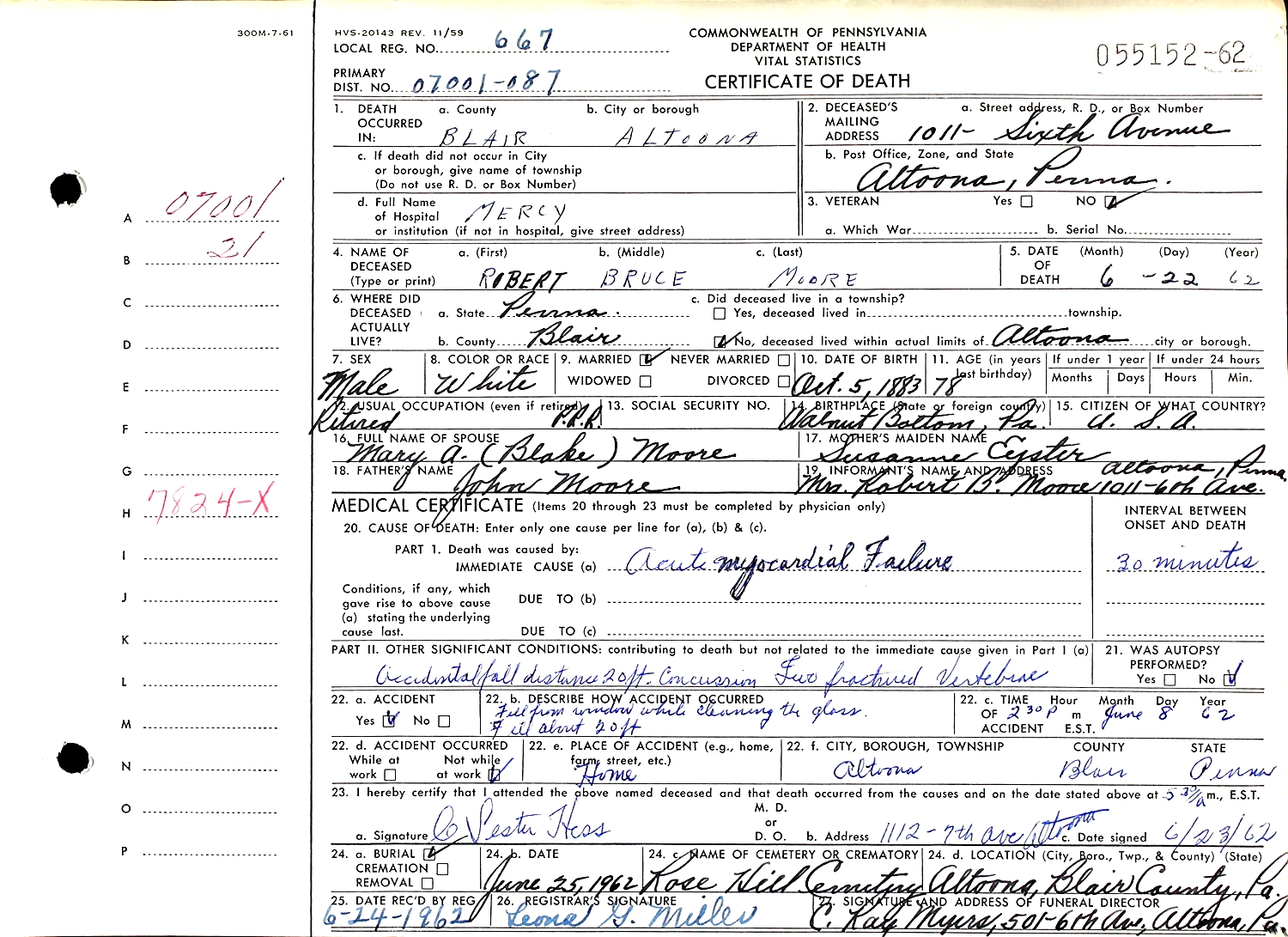 Robert Bruce Moore died June 22, 1962, at Mercy Hospital Altoona, Blair Co., PA, at age 78. Buried in Rose Hill Cemetery, Altoona, Blair Co., PA.