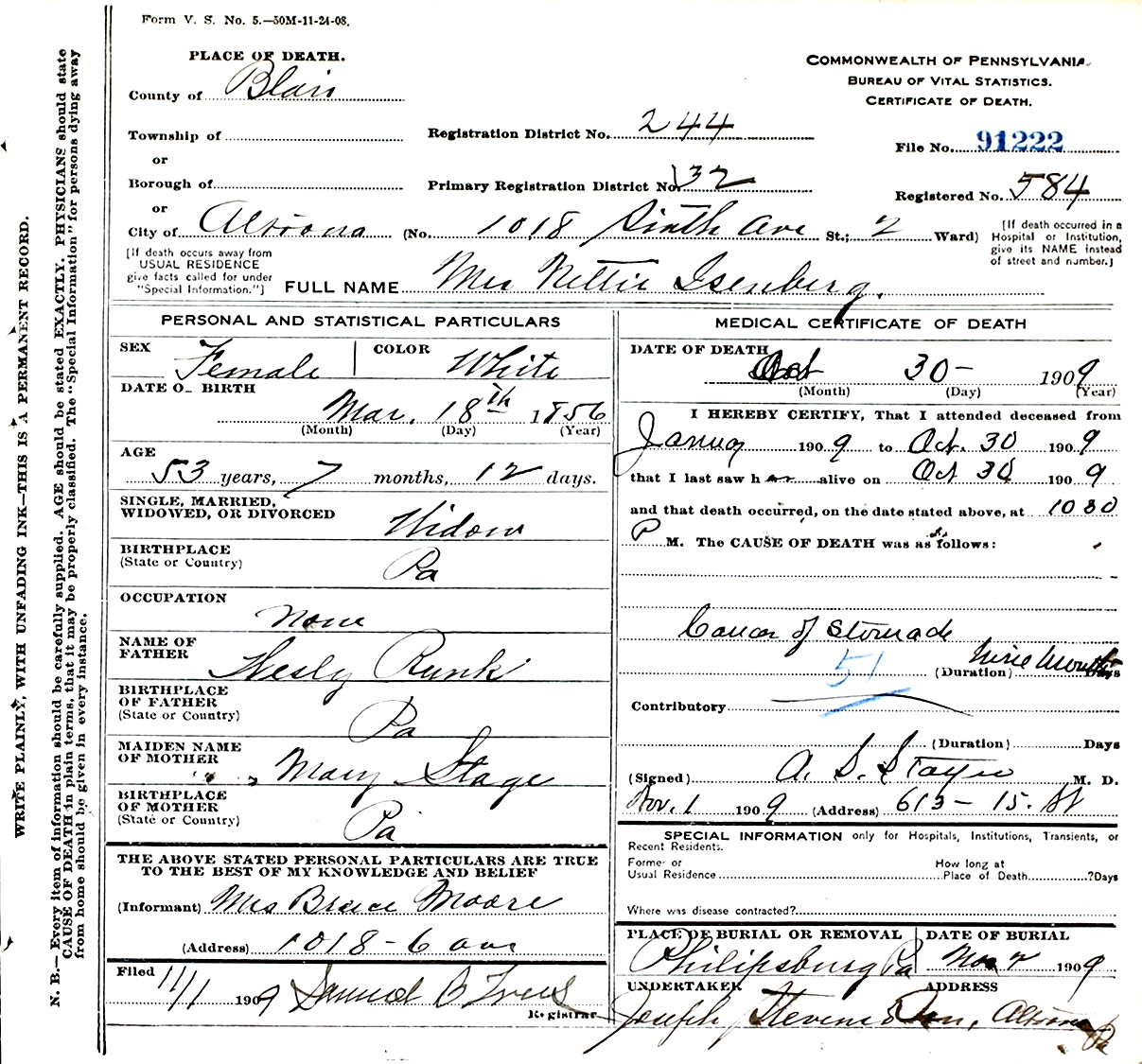 Mrs. Nettie Isenberg, at the residence of her daughter, Mrs. R. Bruce Moore, of 1018 Sixth avenue, Saturday night at 10:30 o'clock, of cancer of the spleen, from which she had been suffering for some time. The deceased was born in Centre county, March 18, 1856, and during the past fifteen years she has been a resident of this city, her husband, Abraham preceding her to the grave seven years ago. Two children, Miss Edna, of Colorado, and Mrs. Moore, at whose home she died, and one brother, Edward Runk, of Toledo, O., and two sisters Mrs. Mattie Radibaugh and Mrs. Helen Schnotz, both of Centre county, survive. he was a member of the First United Evangelical church. Funeral services will be held at the home of the daughter this evening at 7:30 o'clock, and tomorrow the remains will be taken to Phillipsburg, where interment will be made.