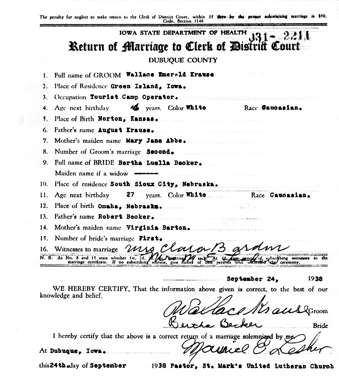 Wallace Emerald "Wally" Krause and Bertha Luella Becker were married September 24, 1938, at St. Mark's United Lutheran Church, Dubuque, Dubuque Co., IA.