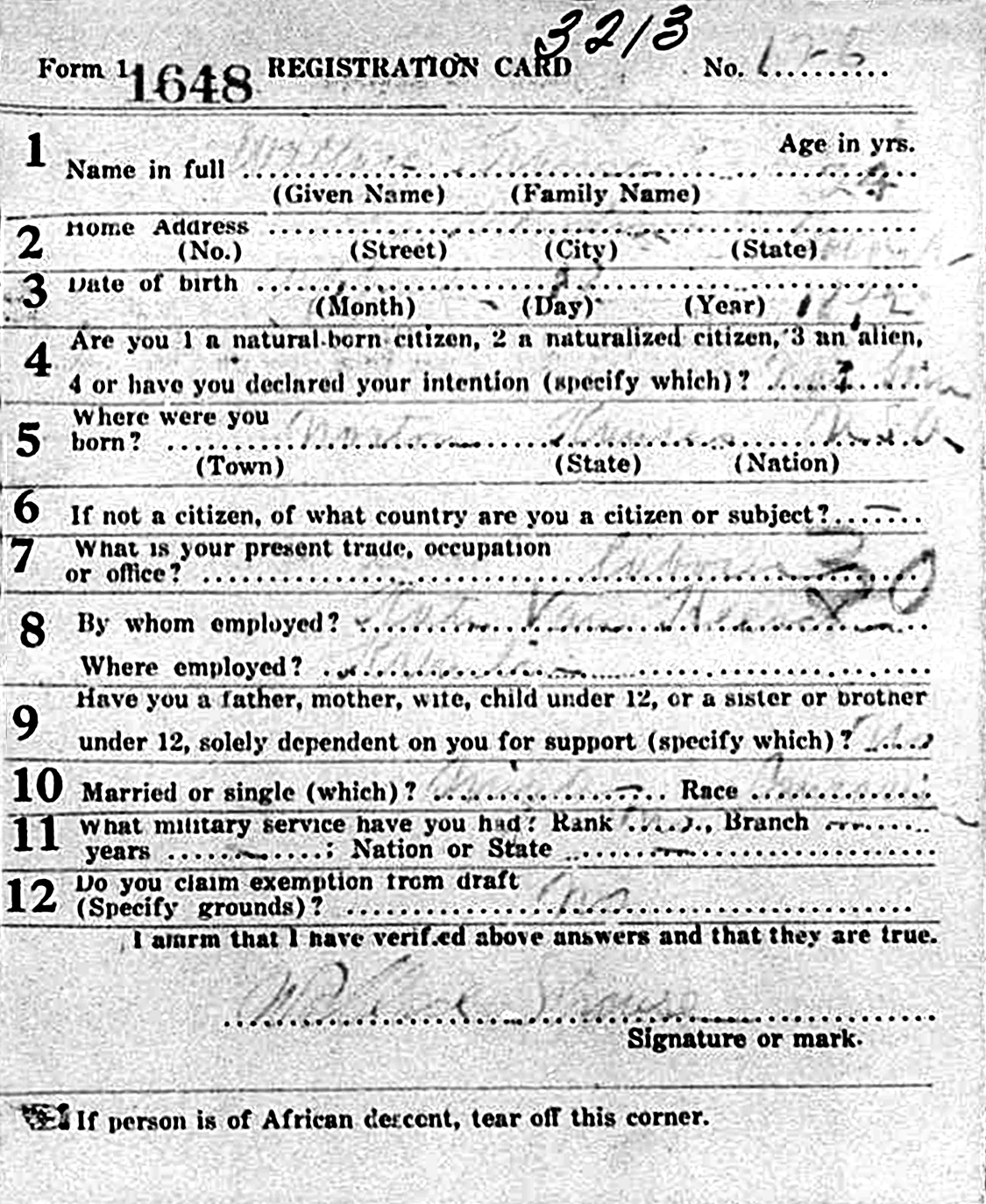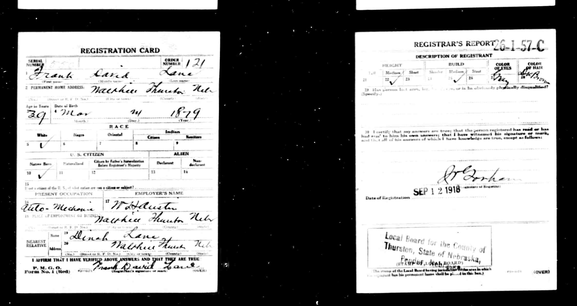 The WWI Draft Register Report dated September 12, 1918, shows Frank David Lane (age 39) is an Auto Mechanic living in Walshire, Thurston Co., NE. He works for W. H. Austin of Walthill. His nearest relative is Dinah Lane of Walthill. He is of Medium height, Medium build, Grey eyes and dark brown hair.