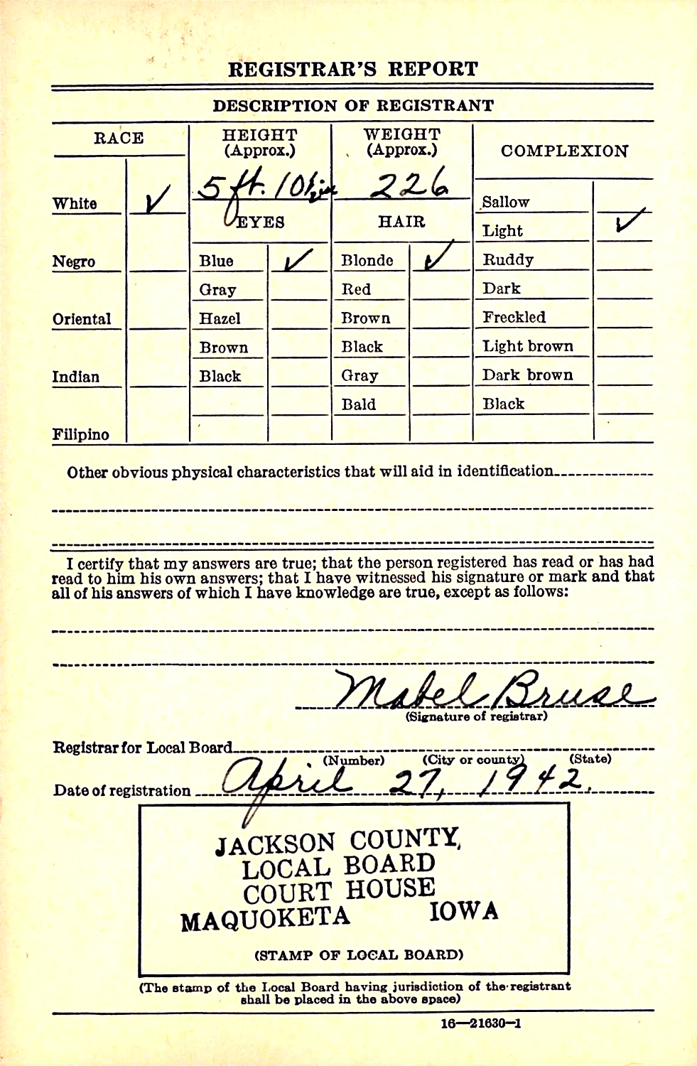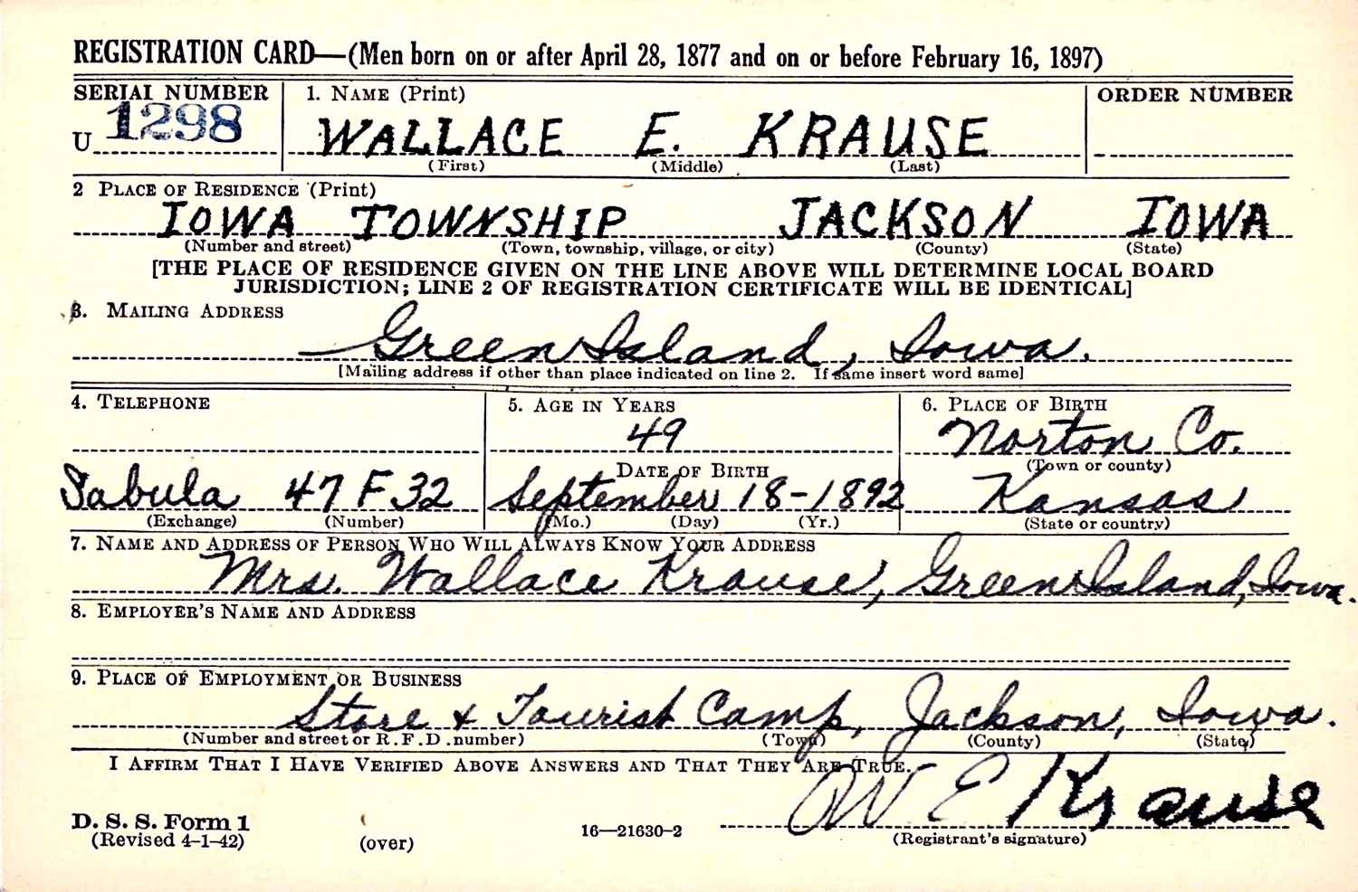 The WWII Draft Register Report dated April 27, 1942, shows Wallace E. Krause (age 49), born September 18, 1892, in Norton Co., KS, operates a Store and Tourist Camp in Jackson, IA, and is living in Iowa Twp., Jackson Co., IA, with a mailing address of Green Island, IA.
