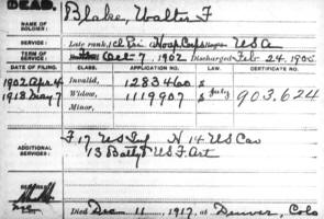 On May 7, 1918, Amy Blake filed for a Widow's Pension for the service of her deceased husband, Walter Francis Blake .