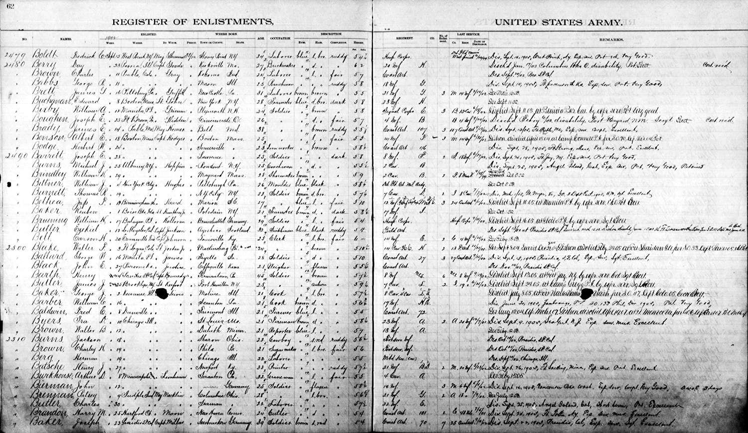 Walter Francis Blake Deserted on September 8, 1904; Surrendered on December 21, 1904; and was Dishonorably Discharged on February 24, 1905, at Fort Sheridan, IL, per Special Order 33, Dept. Lakes 05.16. Pvt.