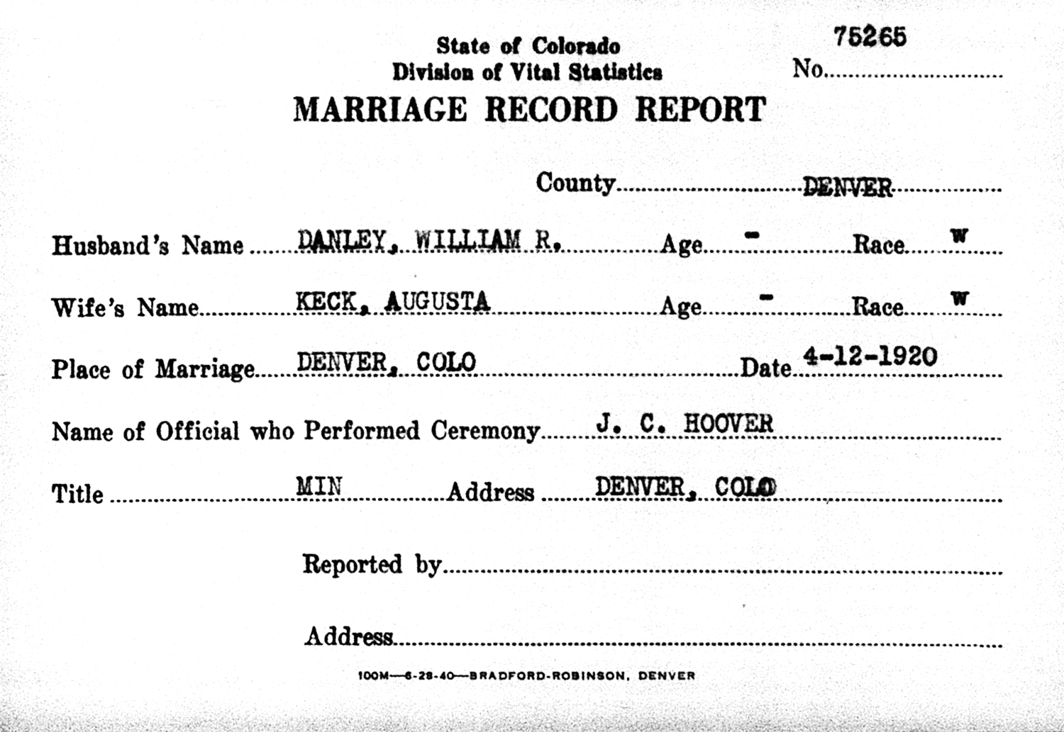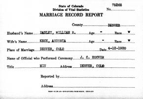William R. Danley and Augusta Keck were married April 12, 1920, in Denver, Denver Co., CO.