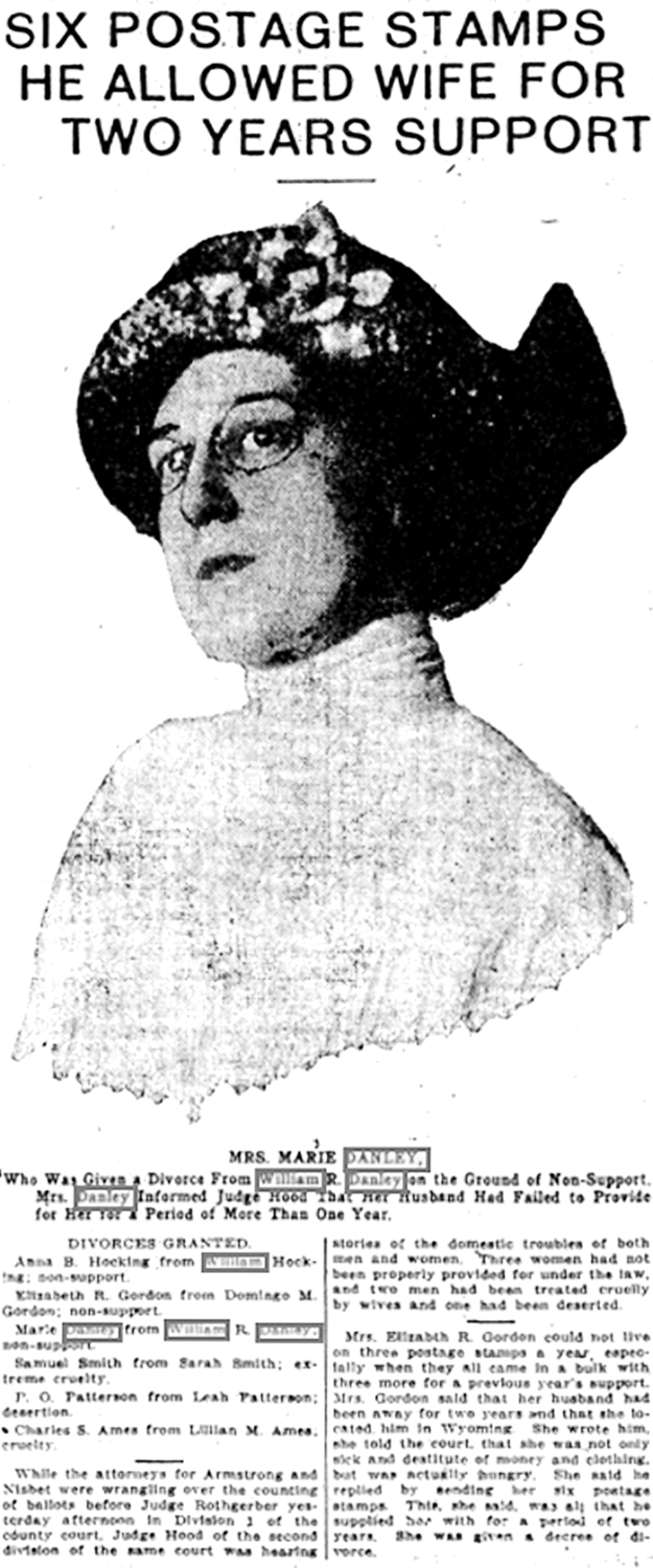Marie Smith received a divorce from William Rowland Danley in July, 1913, in Denver, Denver Co., CO, on the ground of non-support.