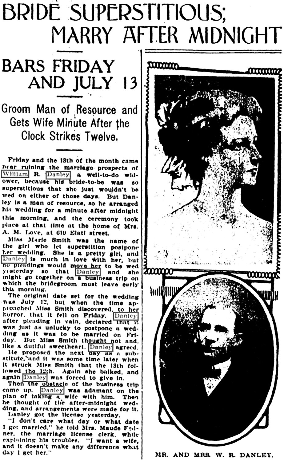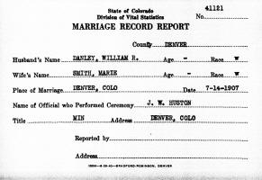William Rowland Danley and Marie Smith were married Saturday, July 14, 1907, in Denver, Denver Co., CO. Marie Smith refused to be married on Friday, the 13th.