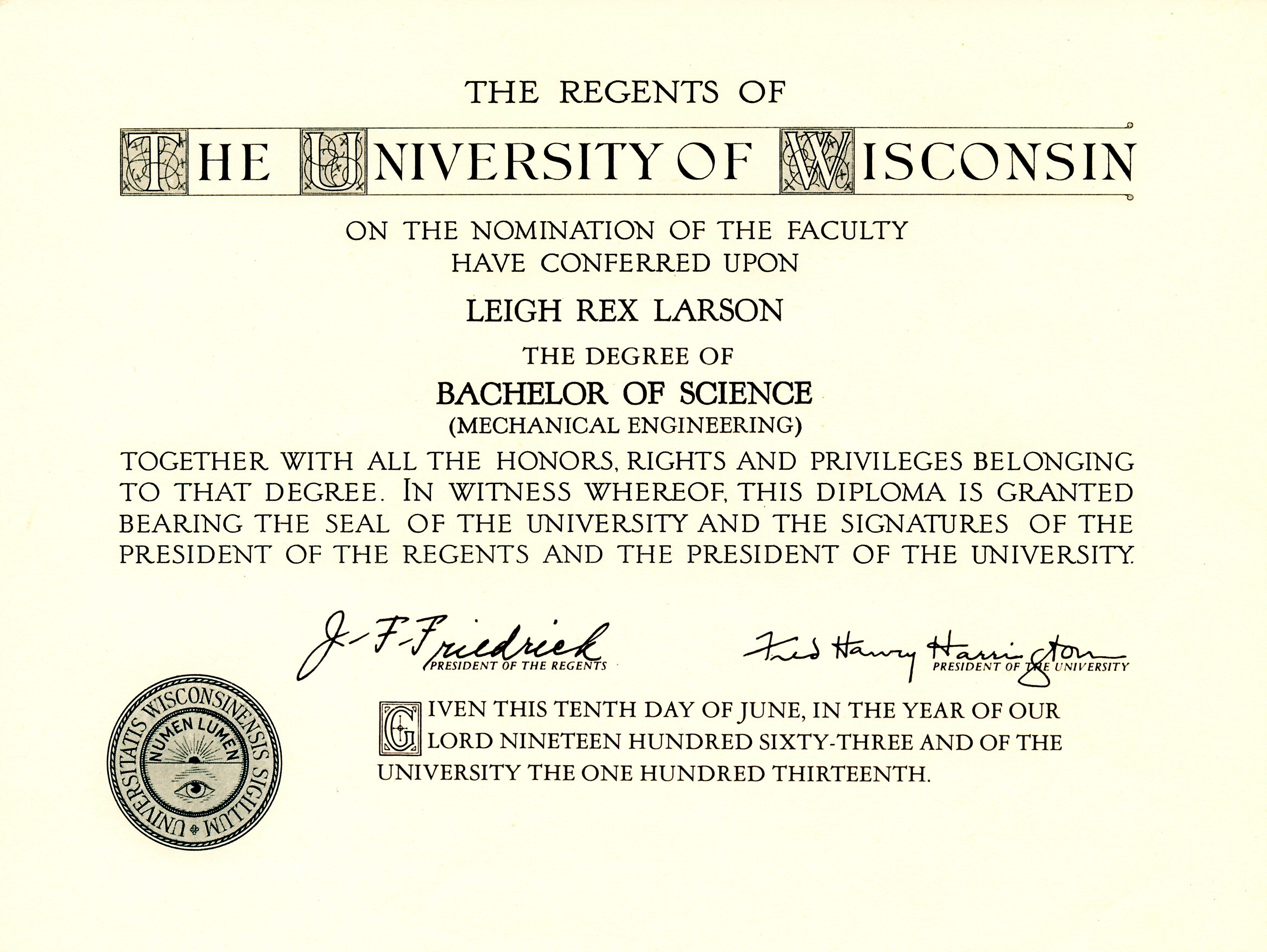 Leigh Rex Larson graduated June 10, 1963, from the University of Wisconsin, Madison, Dane Co., WI, with a Bachelor of Science degree in Mechanical Engineering (BSME).