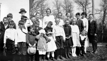 Wilbur Larson (near front row, second from left, with tie blowing in the breeze), School District No. 5, Town of Farmington, Waupaca Co., WI . Jo Hoy, Teacher (back row, second from right), about 1920.