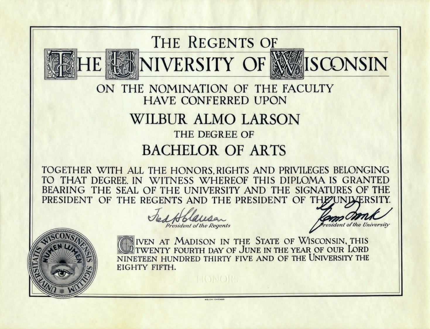, age 22, June 24, 1935 .Wilbur Almo Larson graduated with honors with a Bachelor of Arts degree on June 24, 1935, from the University of Wisconsin, Madison, Dane Co., WI .