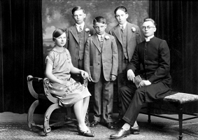 Maude Stratman, Emma and Almo Larson, Wilbur Larson, and the Larson family dog, Carlo, Larson farm, Town of Farmington, Waupaca Co., WI , about 1929.