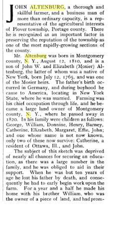 - John Altenburg : Born August 12, 1810, in Montgomery, Orange Co., NY; Died October 25, 1895, at his home, Village of Plover, Portage Co., WI (age 85). Buried in Plover Cemetery, Plover, Portage Co., WI. Married February 7, 1839, in Ellington, Chautauqua Co., NY, to Isabelle Arthur: Born July 13, 1818, in Falconer, Chautauqua Co., NY; Died October 24, 1888, in Village of Plover, Portage Co., WI (age 70). Buried in Plover Cemetery, Plover, Portage Co., WI.