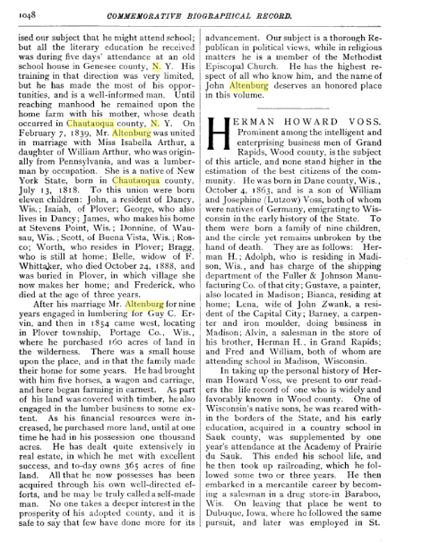 Another of the early residents of Portage county passed away at his home in Plover, last Saturday morning, Oct. 25th, at 9 o'clock. He was taken ill about the 8th inst., but was confined to his bed only one week, the final summons coming sooner than was expected. John Altenburg was born in Montgomery county, N. Y., Aug. 12th, 1810, and was therefore 85 years of his age. He was married at his native home, to Miss Isabelle Arthur, Feb. 7th, 1837. Mr. Altenburg came west in 1854, buying the farm on which he died, and his family followed in 1856, residing here ever since. Mrs. Altenburg died on the 24th of October, 1888. They leave ten children, Bragg, Worth and Roscoe, of Plover; Isiah, Scott and Mrs. Whitaker, of Buena Vista; Daniel, of Wausau; John and George of Dancy and James of this city. Uncle John Altenburg had been a member of the M. E. church for 25 years, and was a most honorable man, respected throughout the whole county. His word was as good as a bond at all times, and the confidence of his friends was never misplaced or abused. The world is better for the presence of men such as he. The funeral took place from the M. E. church at Plover, Monday afternoon, at 1:30 o'clock, Rev. Mr. Carmicheal officiating, and was largely attended, people being present from all arts of the county, including a number of this city. The pallbearers were all old friends and neighbors of the deceased, Moses Pauriea, Moses Steward, John Gilman, John McGown, Joseph Gilman and Chas.. Smith.