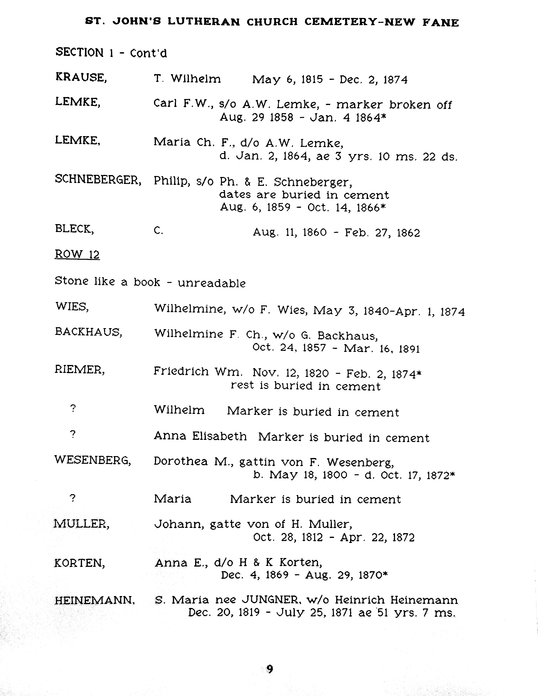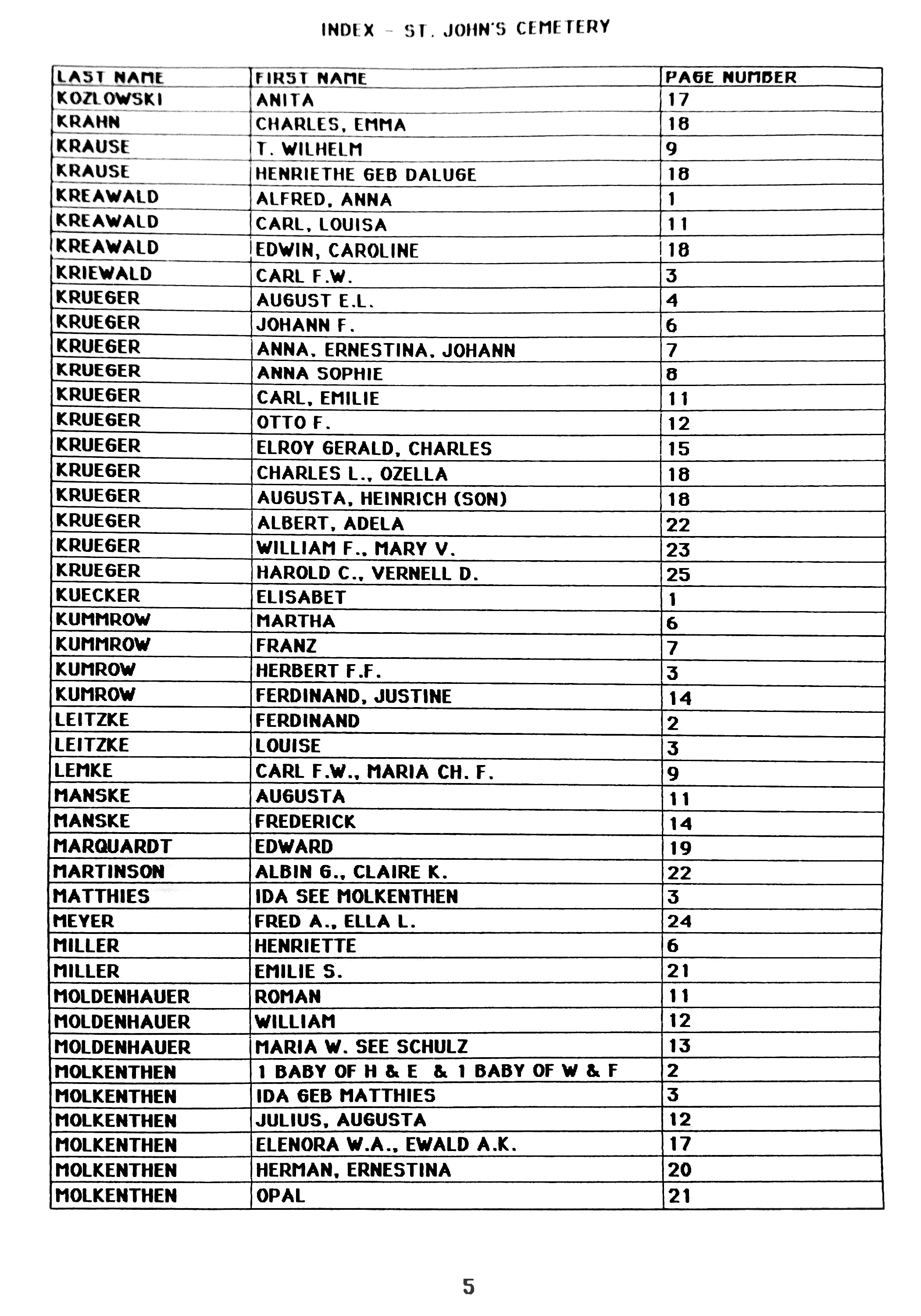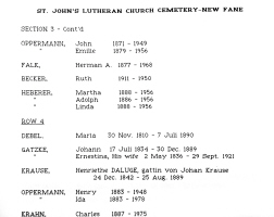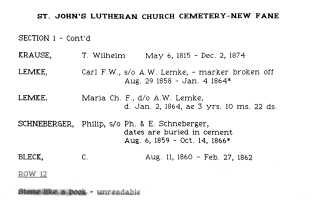 - Johanna Louisa Krause: Born December 6, 1858, in Schwabach, Prussia, Germany ; Died June 29, 1929, in Fond du Lac Co., WI (age 70). Buried in Saint John Lutheran Church Cemetery, Town of Auburn, Fond du Lac Co., WI. Married May 27, 1875, in Fond du Lac Co., WI, to Albert William Ferdinand Butzke: Born June 27, 1840, in Grobunz, Germany; Died March 20, 1927, in the Town of Auburn, Fond du Lac Co., WI (age 87). Buried in Saint John's Lutheran Church Cemetery, Town of Auburn, Fond du Lac Co., WI.