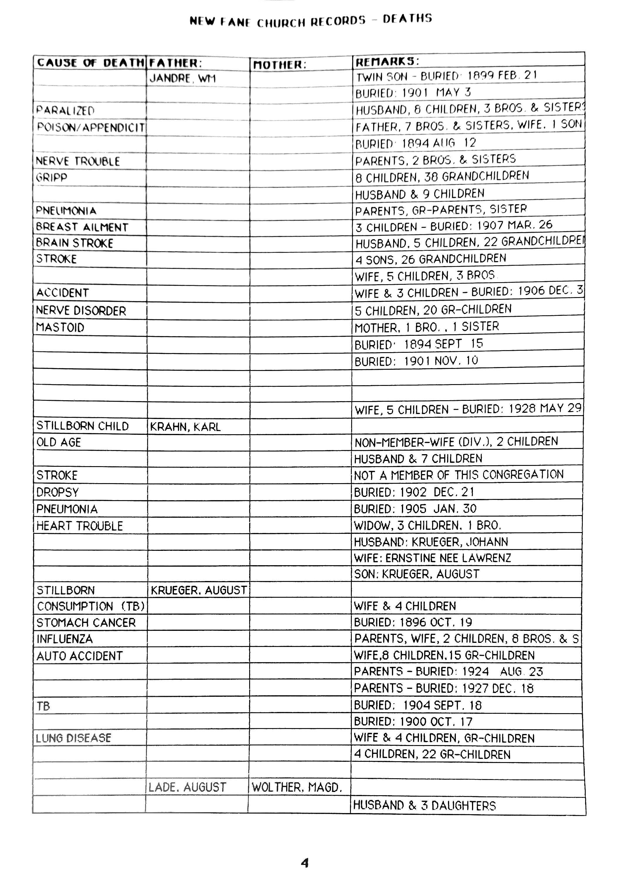 - August Ferdinand Krause: Born November 13, 1855, in Schwabach, Prussia, Germany ; Died August 28, 1934, at Laird Memorial Hospital, City of Norton, Norton Co., KS (age 79). Buried in Spring Green Cemetery, Spring Green Twp., Furnas Co., NE. Married March 2, 1880, in Fond du Lac Co., WI, to Mary Jane Abbey: Born July 3, 1859, in Clarke Twp., Durham Co., Canada West; Died July 17, 1954, in the hospital of Fairview Rest Home, Degolia, Bradford Twp., McKean Co., PA (age 94). Buried in Spring Green Cemetery, Spring Green Twp., Furnas Co., NE.