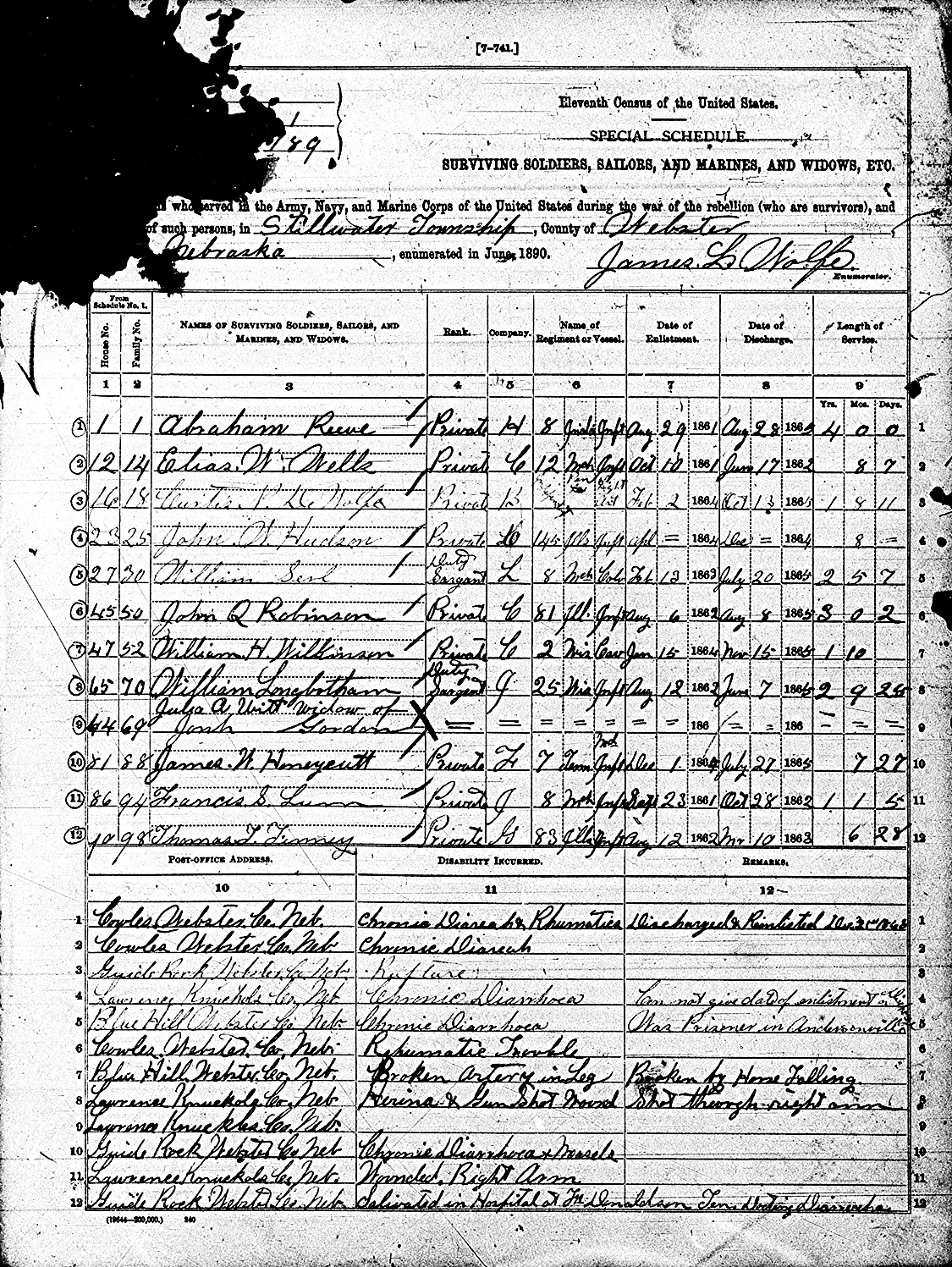 The 1890 Veterans Schedule dated June 1890 shows William Serl was living in Stillwater Twp., Webster Co., NE, with Post Office of Blue Hill. He suffered from chronic diarrhea. He was a Duty Sergeant in Company L, 8th Michigan Cavalry, enlisting on February 13, 1862 and discharged on July 20, 1865, after 2 years, 5 months and 7 days. He was a prisoner at Andersonville.