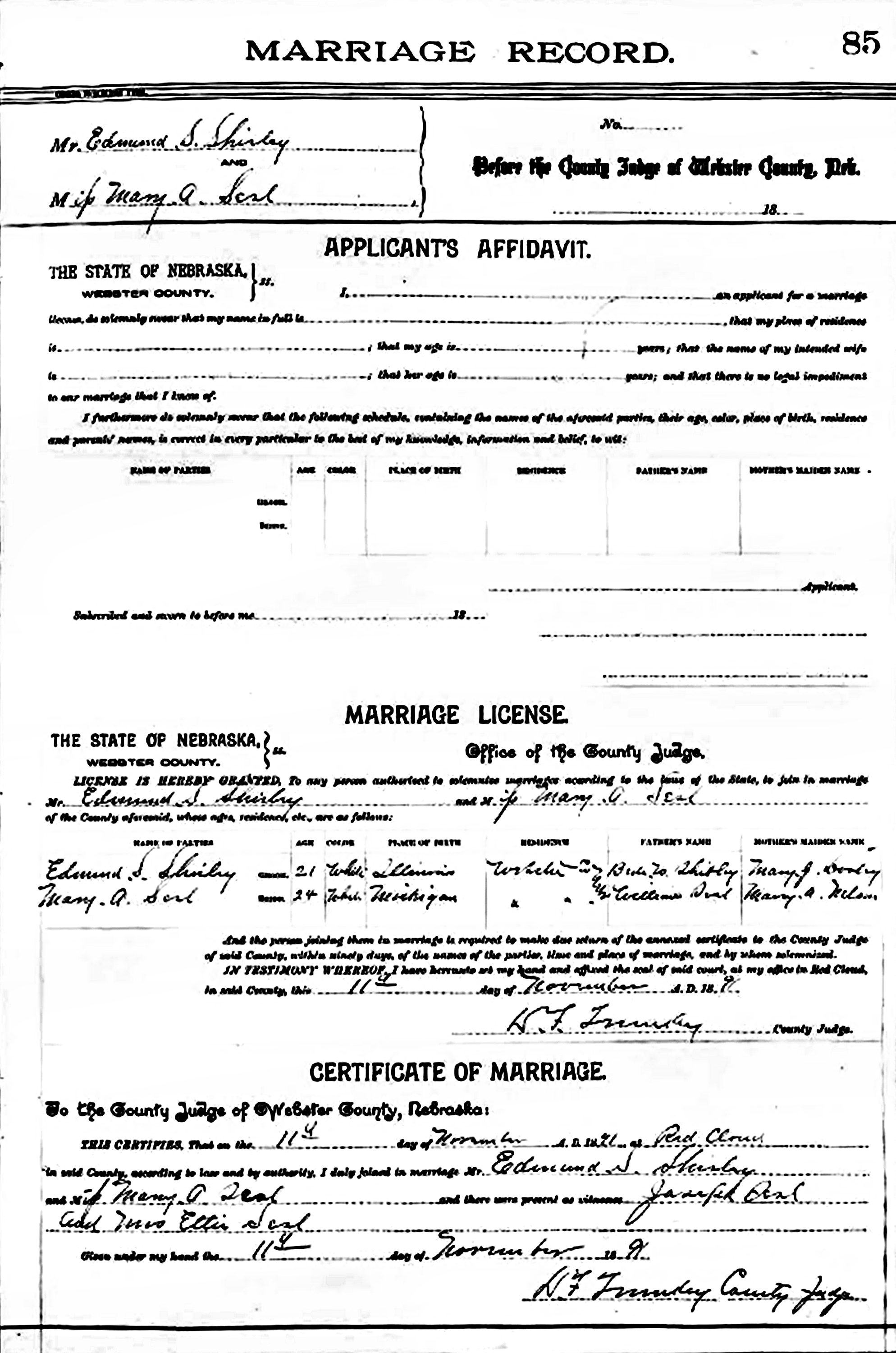 Abner Samuel Edmund Shirley and Mary Angela Serl were married October 11, 1891, in Red Cloud Twp., Webster Co., NE.