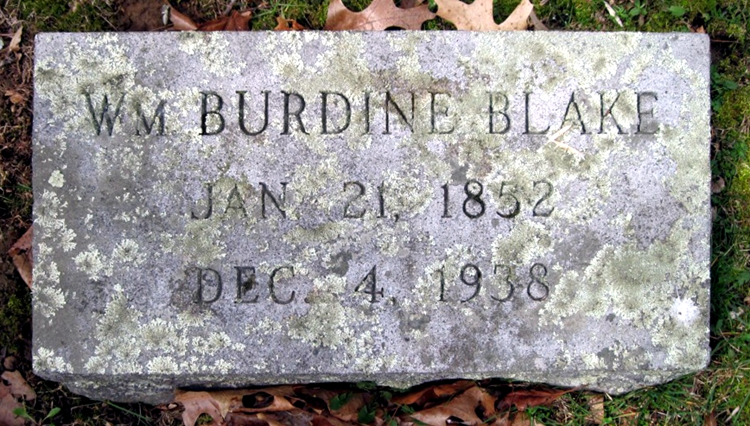 William Burdine "Will" Blake died December 4, 1938, in Ronceverte, Greenbrier Co., WV, at age 86. Buried in Riverview Cemetery, Ronceverte, Greenbrier Co., WV.