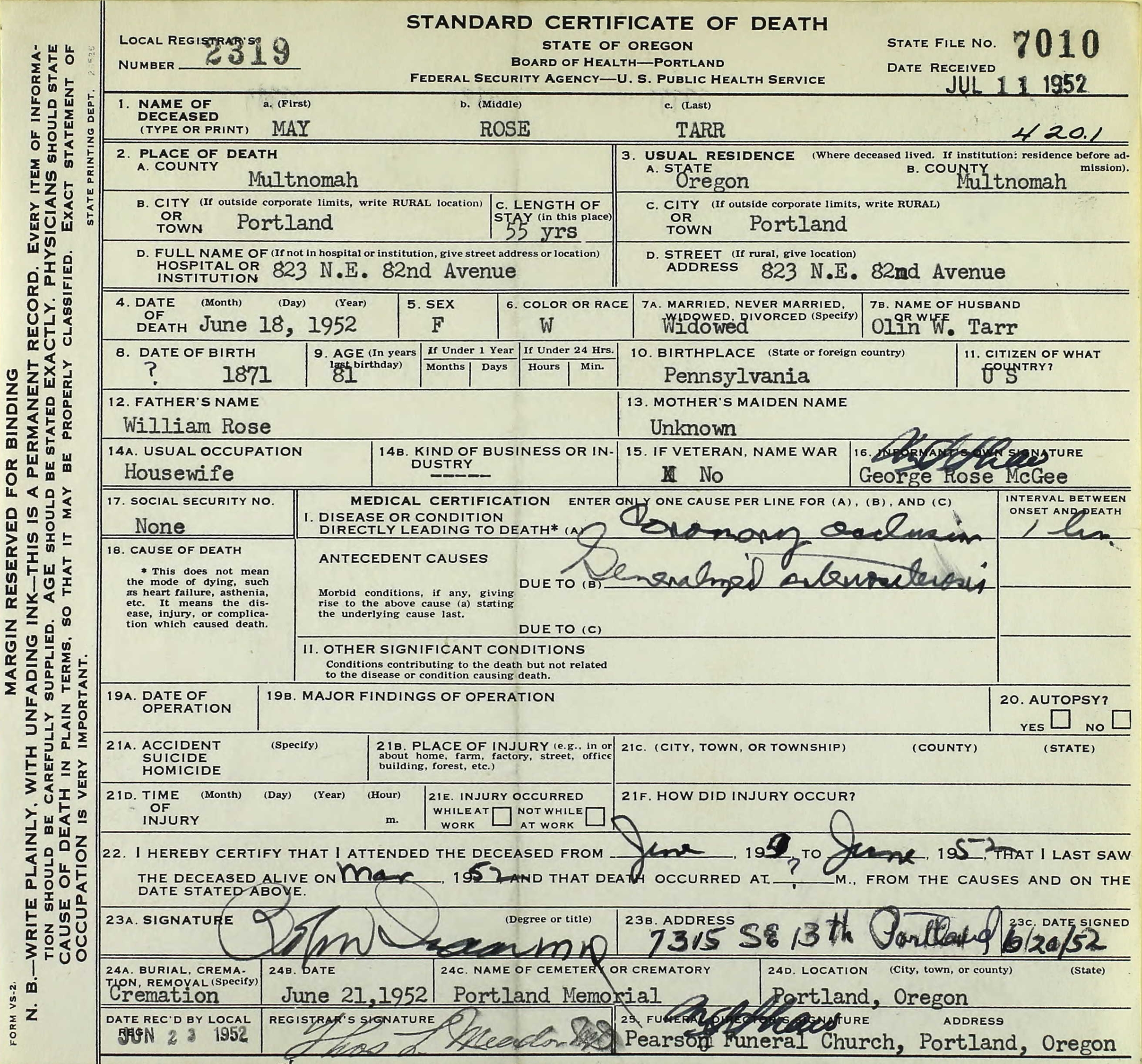 May (Rose) (Watson) Tarr died June 18, 1952, in Portland, Multnomah Co., OR, at about 81. Interred in Wilhelm's Portland Memorial Mausoleum, Portland, Multnomah Co., OR.