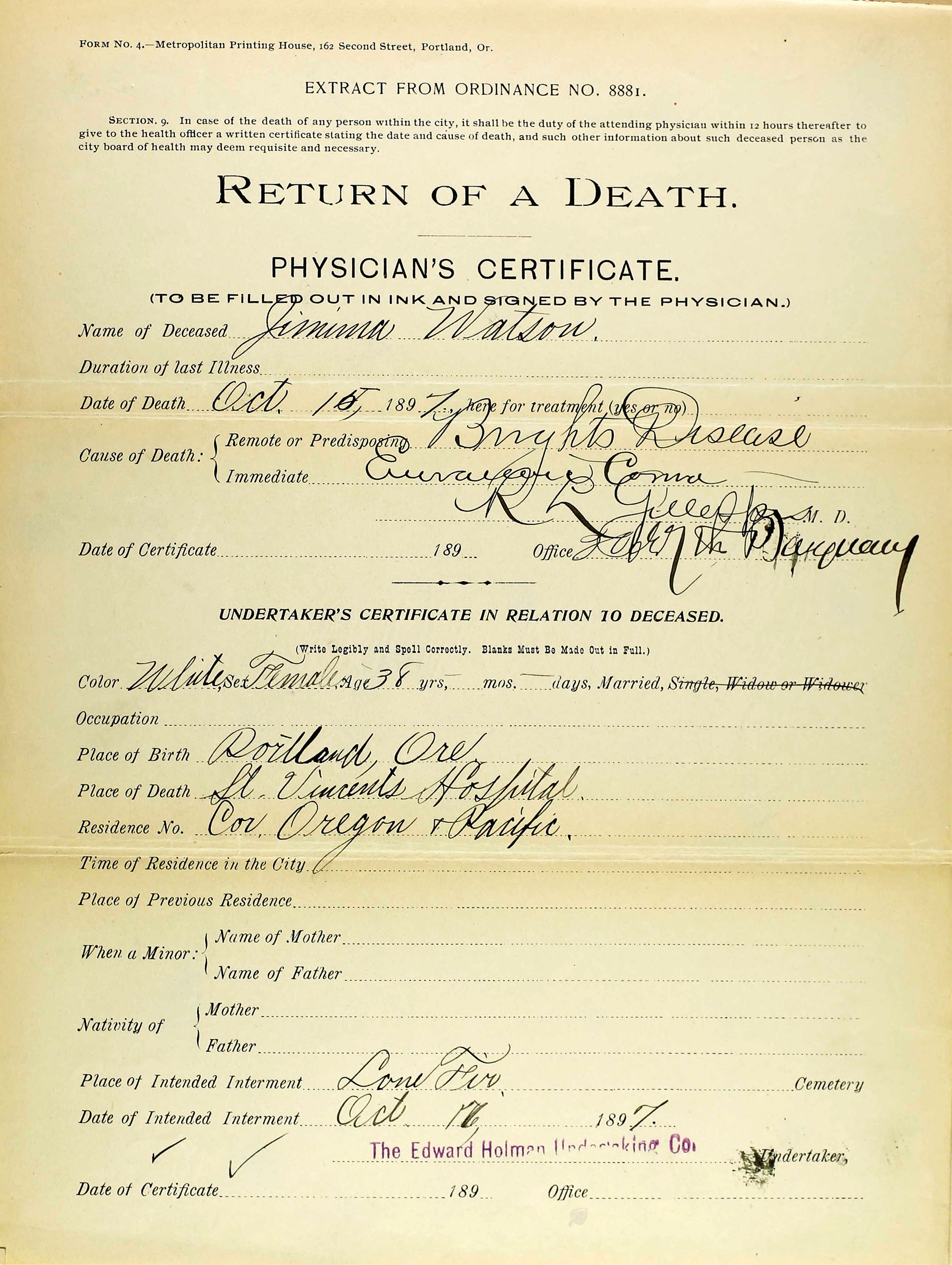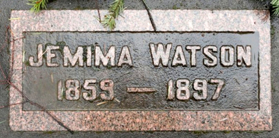 Jemima "Minnie" (Watson) Watson died October 15, 1897, at St. Vincent's Hospital, Portland, Multnomah Co., OR, at age 39. Buried in Lone Fir Pioneer Cemetery, Portland, Multnomah Co., OR.