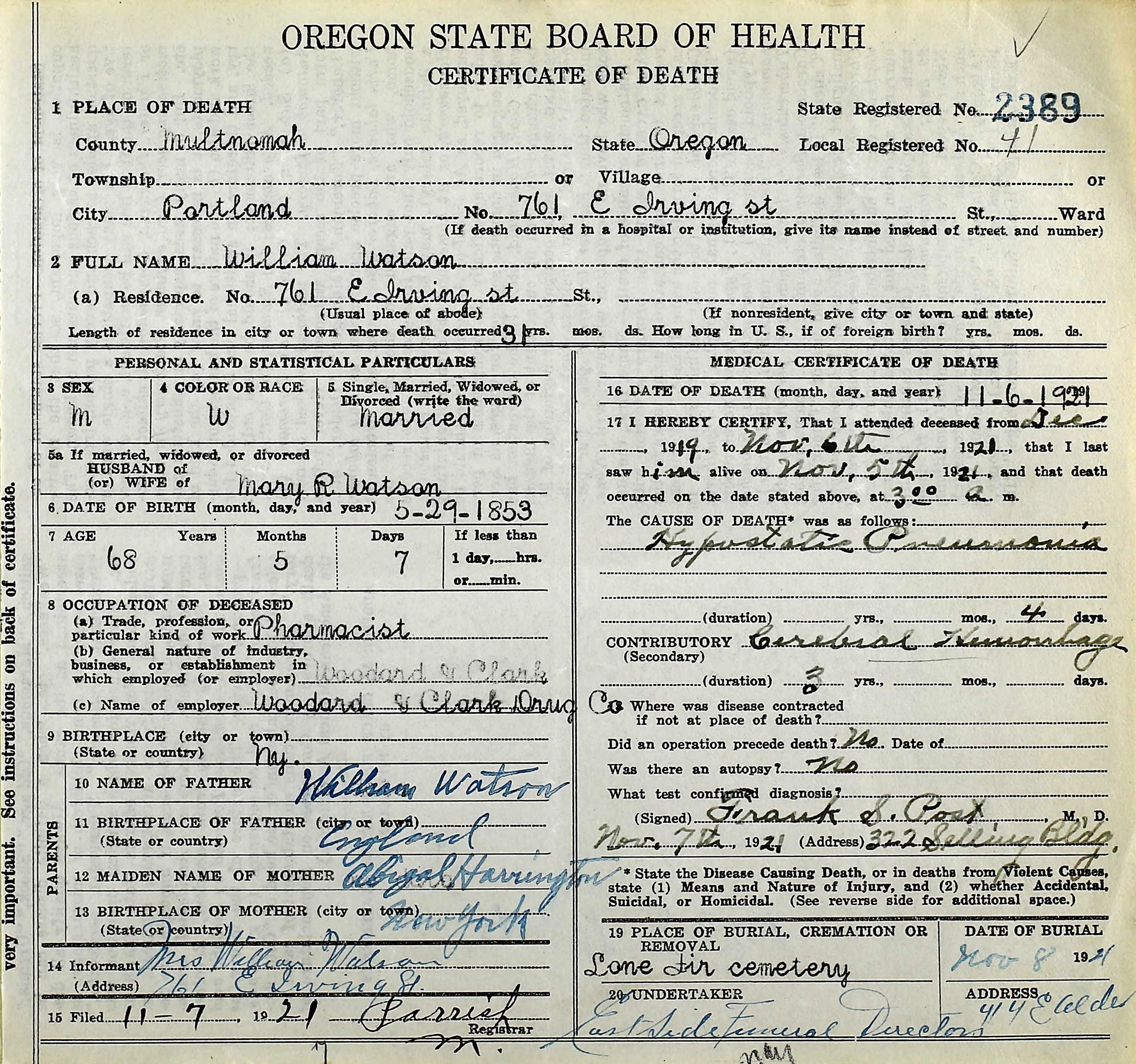 The 1920 U. S. Census taken on January 7, 1920, shows William E. Watson (age 63) born in New York to England-born parents, is a married Head of Household, and who owns his house with a mortgage, and is living at 761 E. Irving, 9th Ward, Portland, Multnomah Co., WI. Living with him is his wife, May Rose Watson (age 48) born in Pennsylvania to Pennsylvania-born parents.
