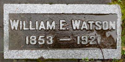 William E. Watson was born May 29, 1853, in the Town of Penfield, Monroe Co., NY, and died November 6, 1921, in Portland, Multnomah Co., OR, at age 68. Buried in Lone Fir Pioneer Cemetery, Portland, Multnomah Co., OR. He is the son of William Watson of Belfast, Ireland, and Abigail Harrington of Watkins Glen, Schuyler Co., NY .