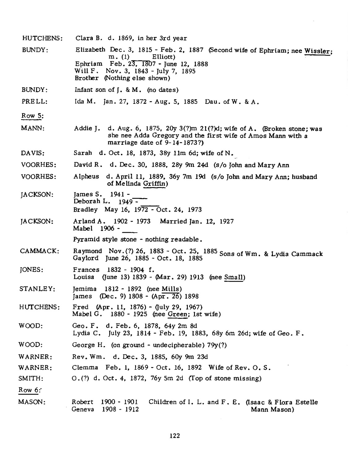 1863 - Mr. and Mrs Ain Ballenger, Mr. and Mrs. Thomas Hutchens, Mr. and Mrs. John Vorhees, Mr. Hess, and Mr. Vergeront were settlers about 1865. Considerable is known of Mr. and Mrs. Vorhees. They were both natives of Guernsey County, Ohio, where they were married and resided until coming to Woodland. Her maiden name was Mary A. Struble. Their family consisted of six children: Elizabeth, later Mrs. Thomas; George; Alpheus W., who married Melinda Griffe; William A.; Eliza C., who married John Sperrier, and lived in Woodland; and John R.