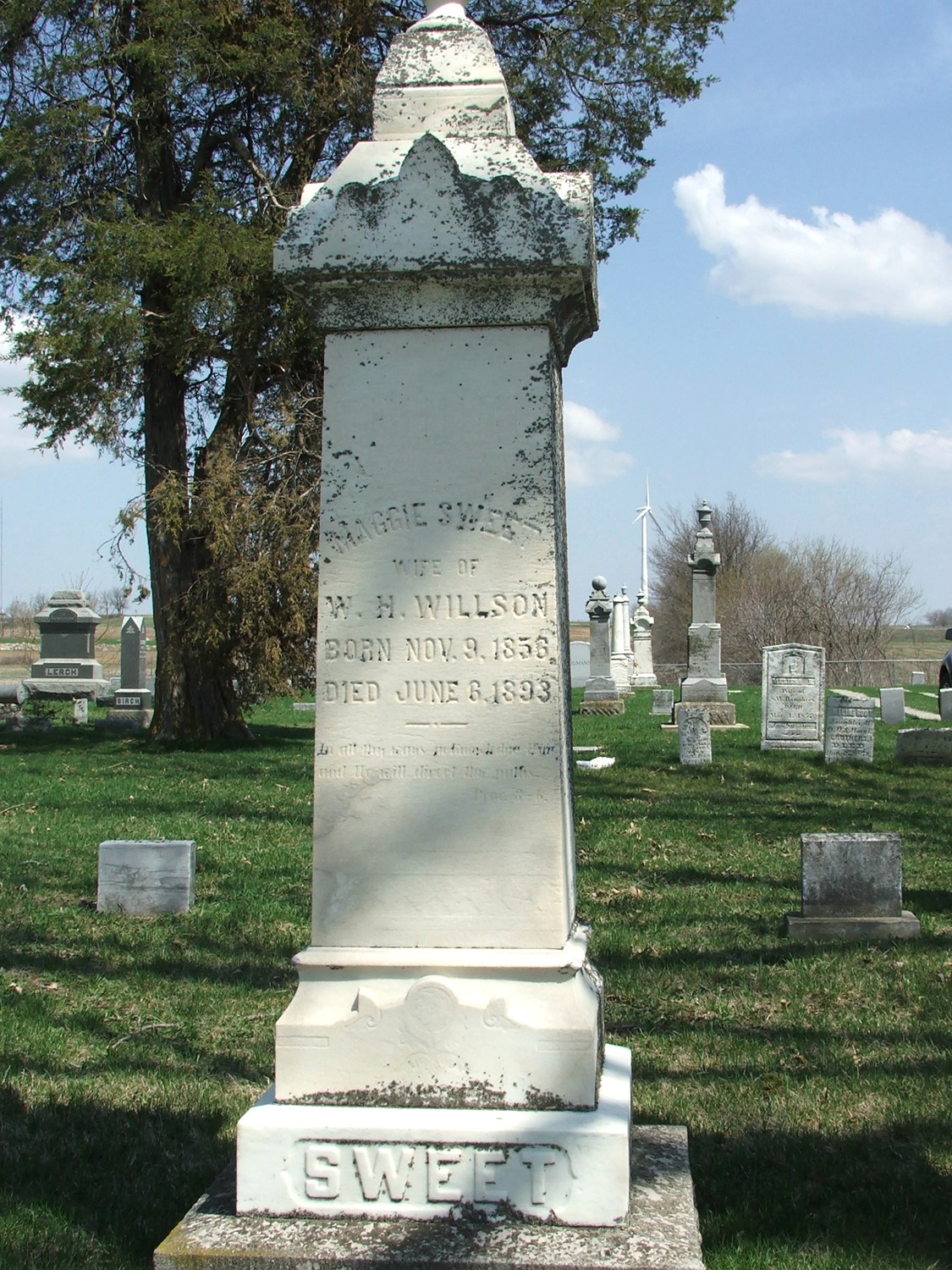 Margaret Rebecca "Maggie" (Sweet) Willson died June 7, 1893, in Byron, Fond du Lac Co., WI, at age 35. Buried in Byron Cemetery, Byron, Fond du Lac Co., WI, with her parents, Sumner Sweet and Elizabeth Evans.