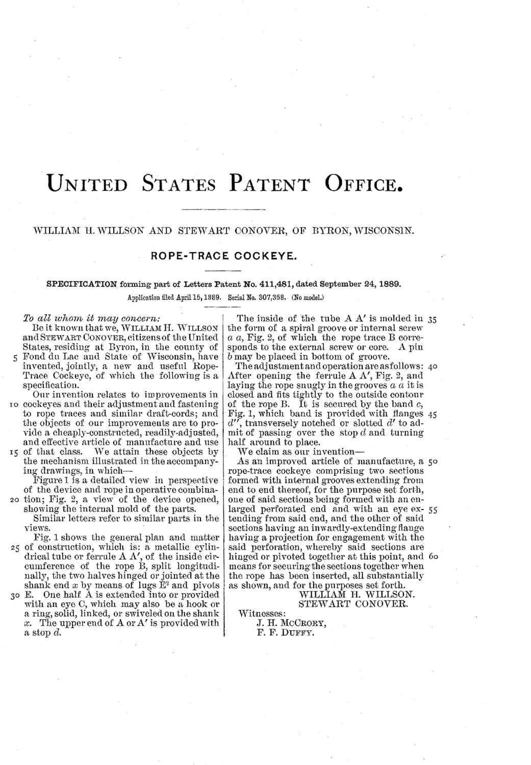 William Henry Willson and Stewart Conover received U. S. Patent No. 411,481 for an improved Rope Trace Cockeye on September 24, 1889.