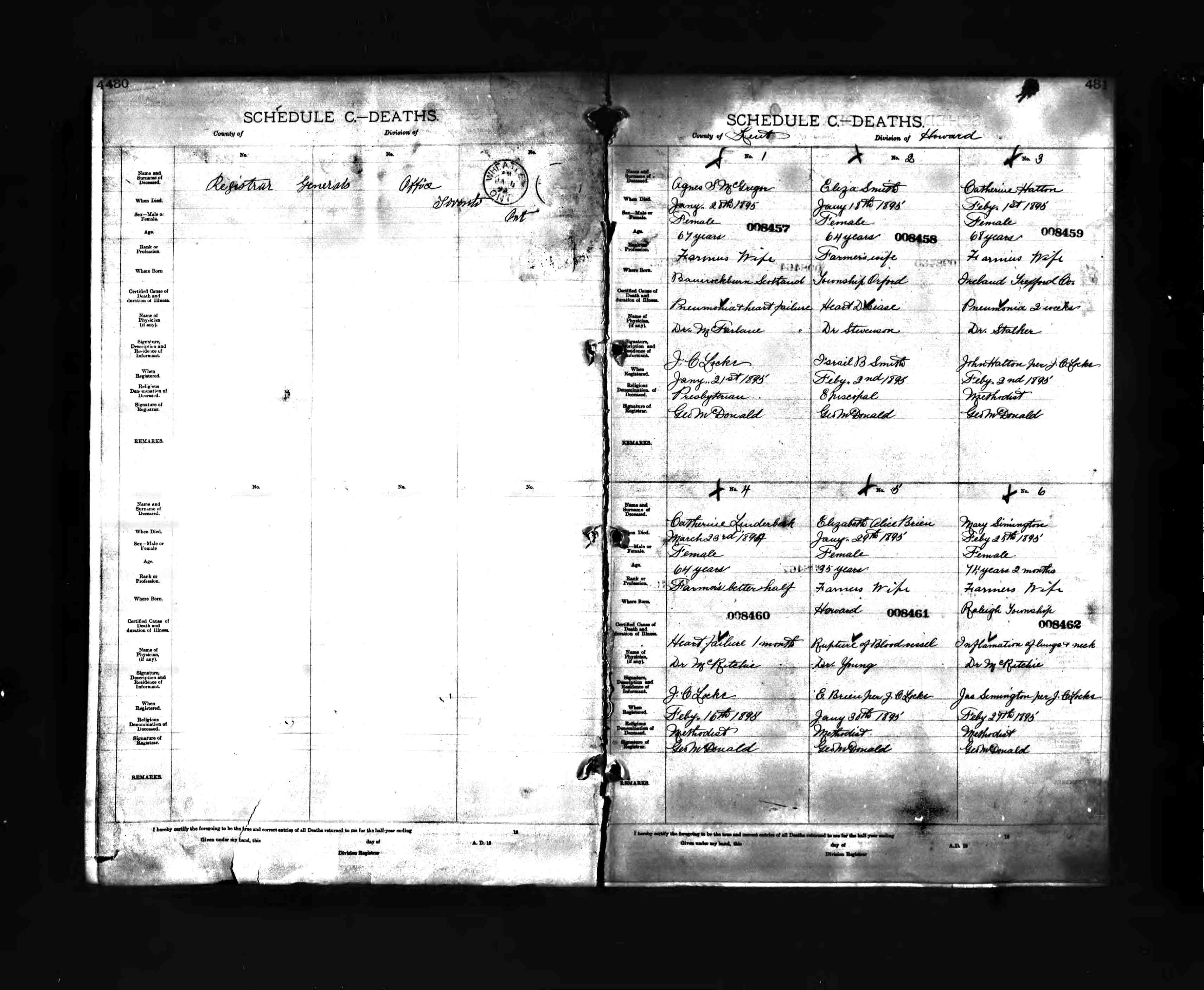 No. 4; Name and surname of deceased: Catherine Lenderbeck; When Died: Mar. 23rd 1894; Sex-Male or Female: Female; Age: 64 years; Rank or Profession: Farmer's better half; Where Born: ; Certified Cause of Death and duration of Illness: Heart Failure/ 1 month; Name of Physician (if any): Dr. McRitchie; Signature, Description and Residence of Informant: J. C. Locke; When Registered: Feby. 16th 1895; Religious Denomination of Deceased: Methodist; Signature of Registrar: Geo. McDonald