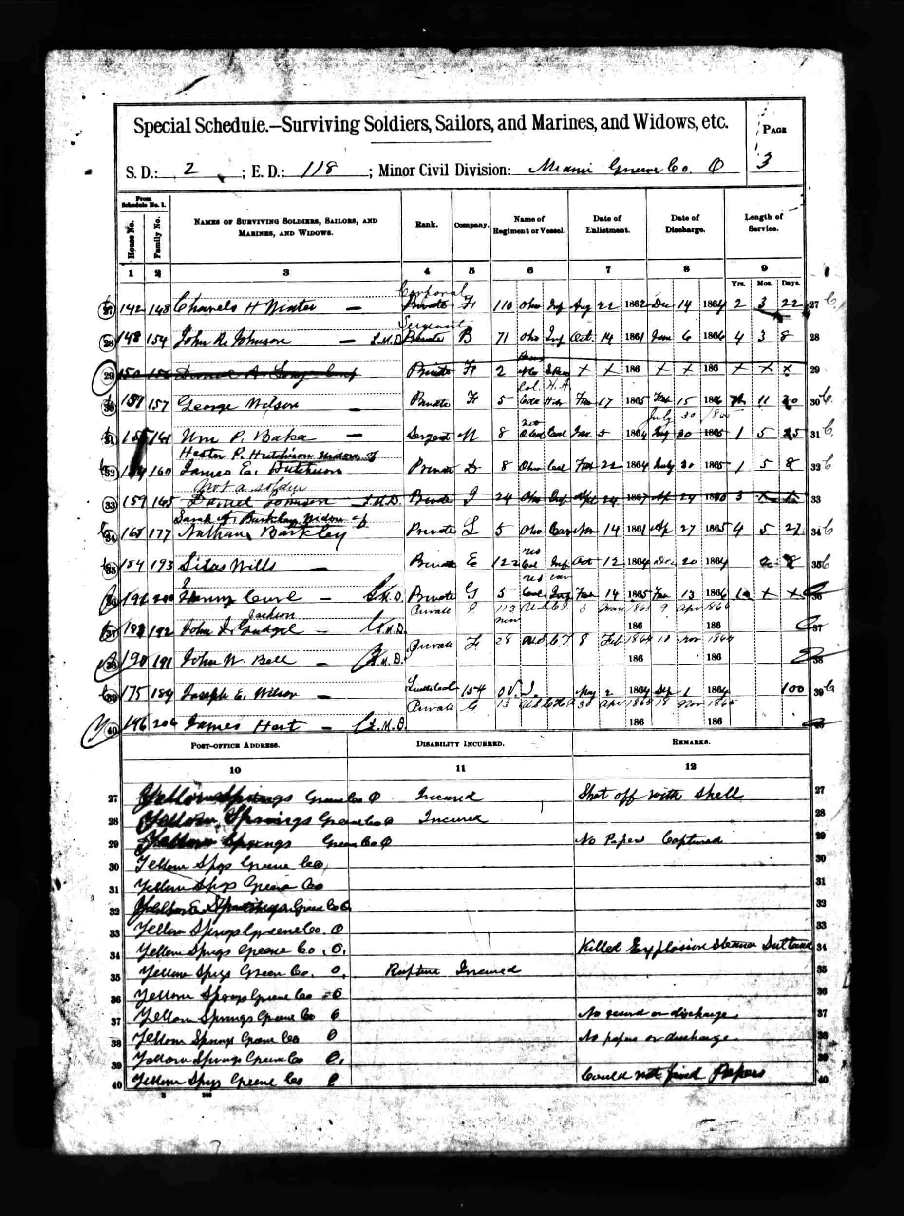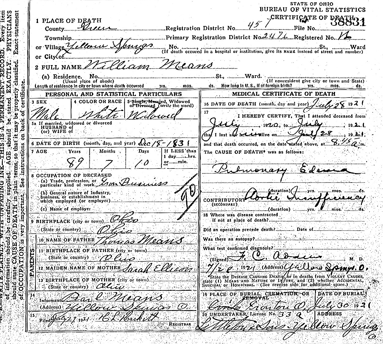 William Albert Means died July 28, 1921, in the Village of Yellow Springs, Greene Co., OH, at age 89. Buried in Woodland Cemetery, Ironton, Lawrence Co., OH.