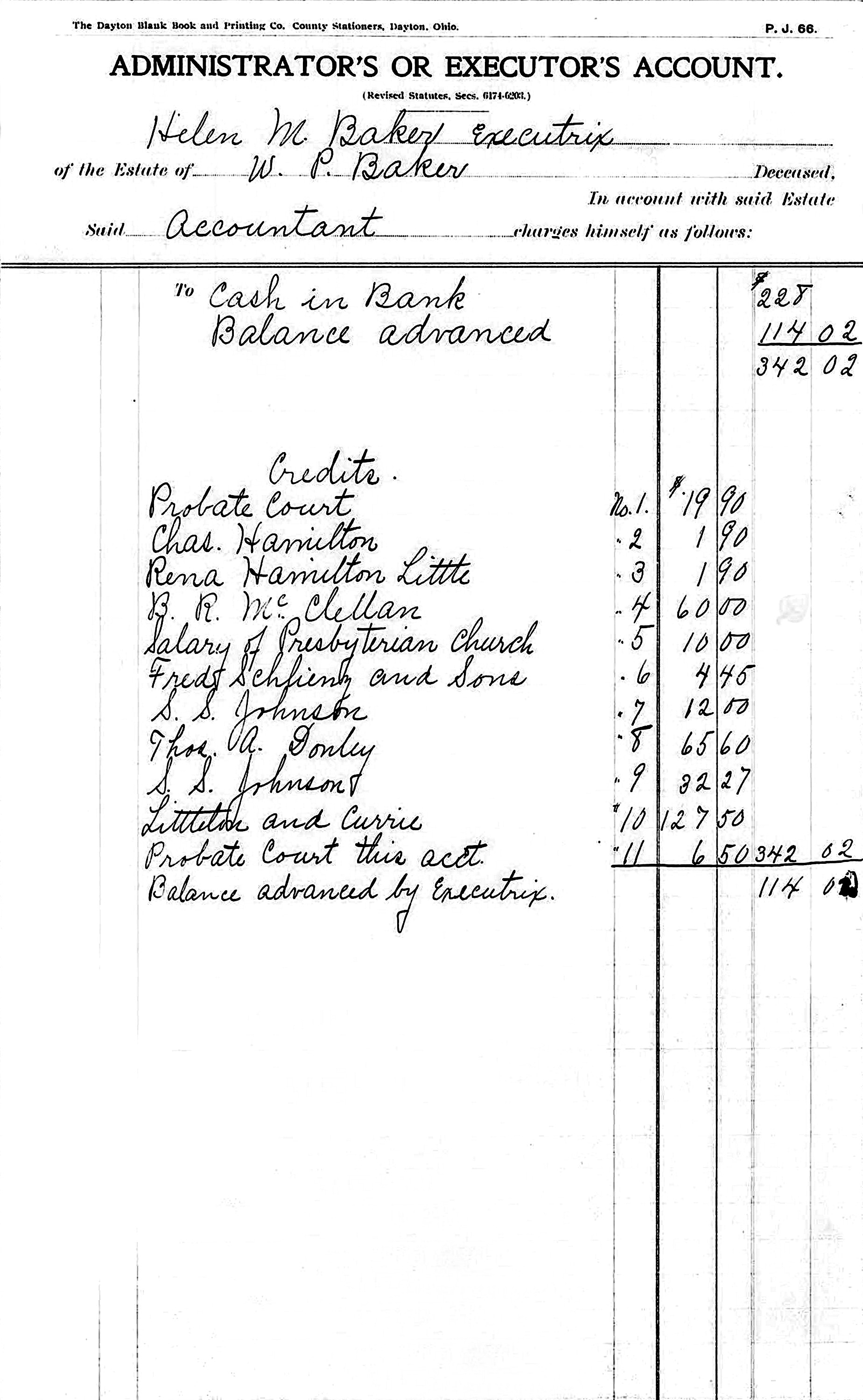 The 1900 U. S. Census taken on June 7, 1900, shows William P. Baker (age 61) born May, 1839, in Ohio to Unknown and Ohio-born parents, is a married House Painter, and who owns his house free of a mortgage, and is living on North College Street, Yellow Springs, Miami Twp., Greene Co., OH. Living with him are: his wife of 26 years, Helen Baker (age 55) born October, 1844, in Prussia to Prussia-born parents, and having emigrated in 1857, and with 2 of the 4 children born to her still alive, a House Wife; his unmarried son, Albert M. Baker (age 22) born December, 1878, in Ohio to Ohio and Prussia-born parents, a College Student; Gertrude P. P. Baker (age 20) born February, 1880, in Ohio to Ohio and Prussia-born parents, a College Student; and his unmarried brother-in-law, Charles G. Gerhardt (age 36) born January, 1864, in Ohio to Prussia-born parents, a Carpenter.