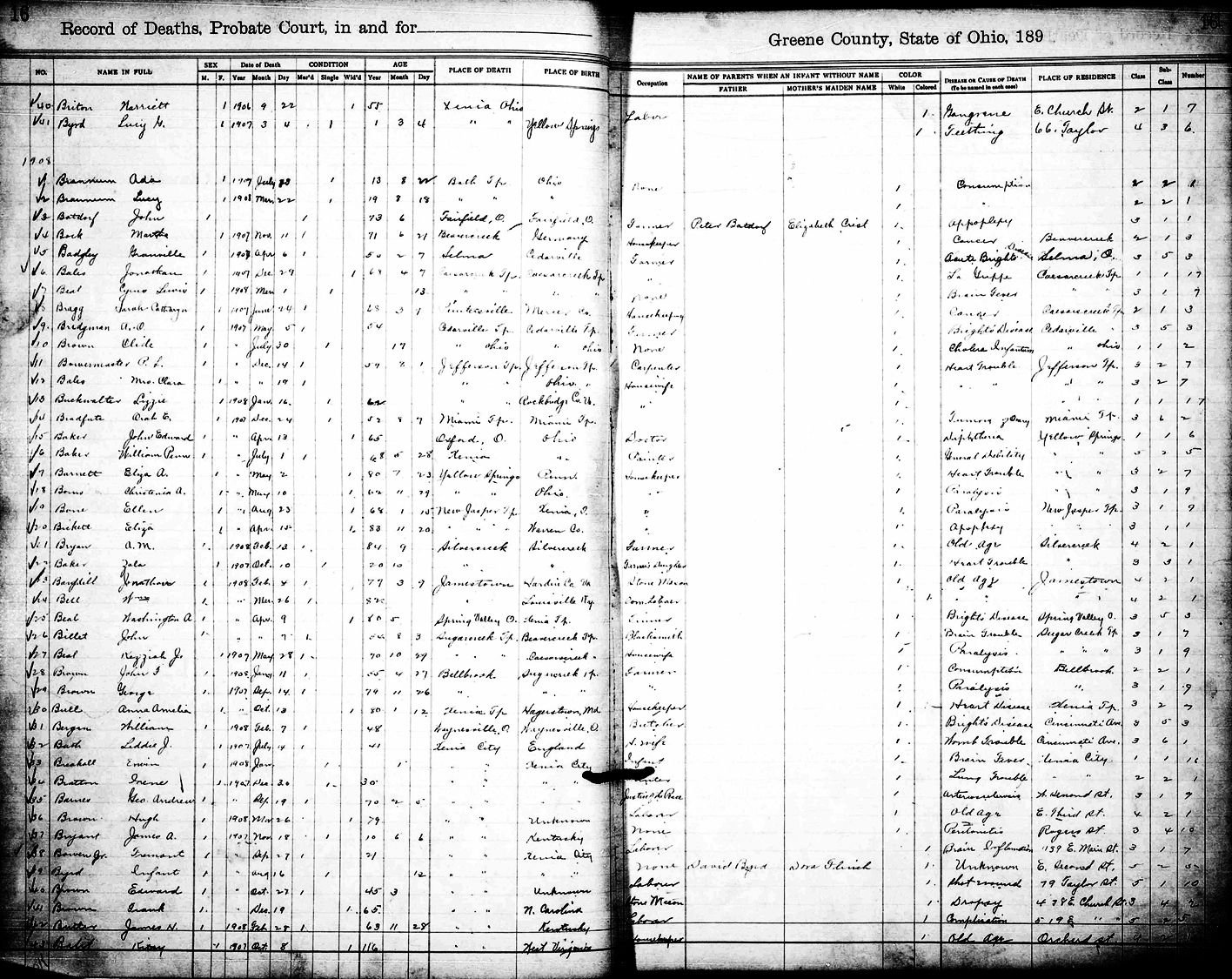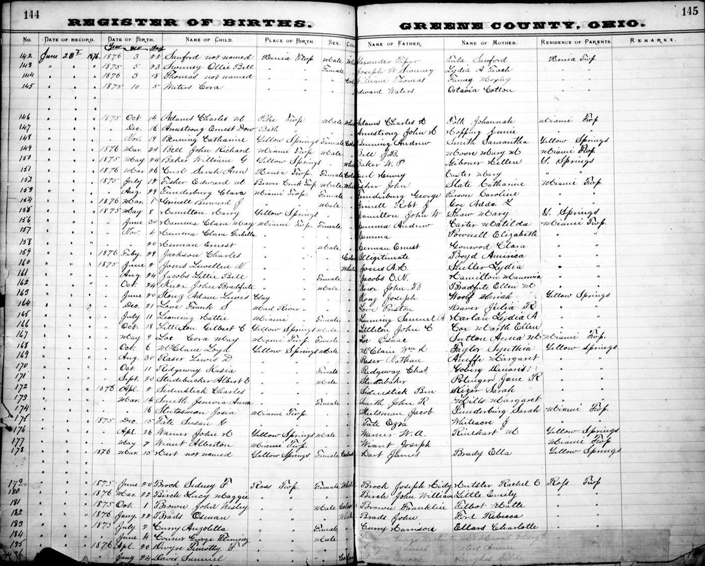 - Ralph W. Baker: Born March 5, 1885, in the Village of Yellow Springs, Miami Twp., Greene Co., OH; Died June 13, 1888, in the Village of Yellow Springs, Miami Twp., Greene Co., OH (age 3). Buried in Glen Forest Cemetery, Yellow Springs, Greene Co., OH.